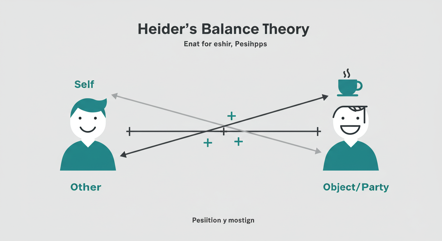 이러한 현상을 설명하는 심리학 이론 중 하나가 바로 심리학자 하이더(Fritz Heider)의 ‘균형 이론(Balance Theory)’입니다. 이 이론은 자신, 상대방, 그리고 사물이나 제3자라는 세 가지 요소 간의 관계성에 대해 설명하고 있어요. 한마디로, 세 요소 간의 관계가 균형을 이루면 심리적으로 안정감을 느끼고, 불균형 상태가 되면 불편함을 느껴 균형을 맞추려고 한다는 거죠.