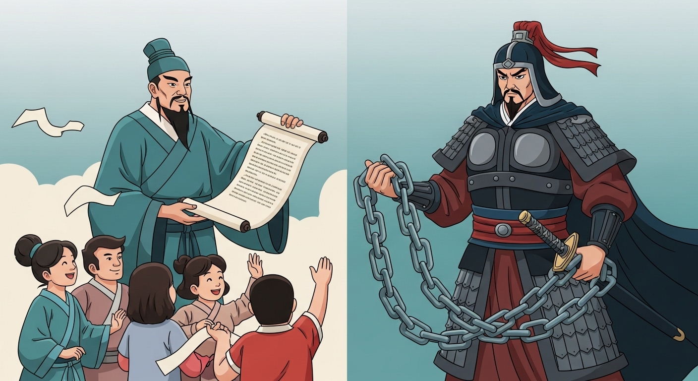 | 법/규칙 | 복잡하고 가혹함 (진나라 계승) | 단순하고 관용적임 (약법삼장) |