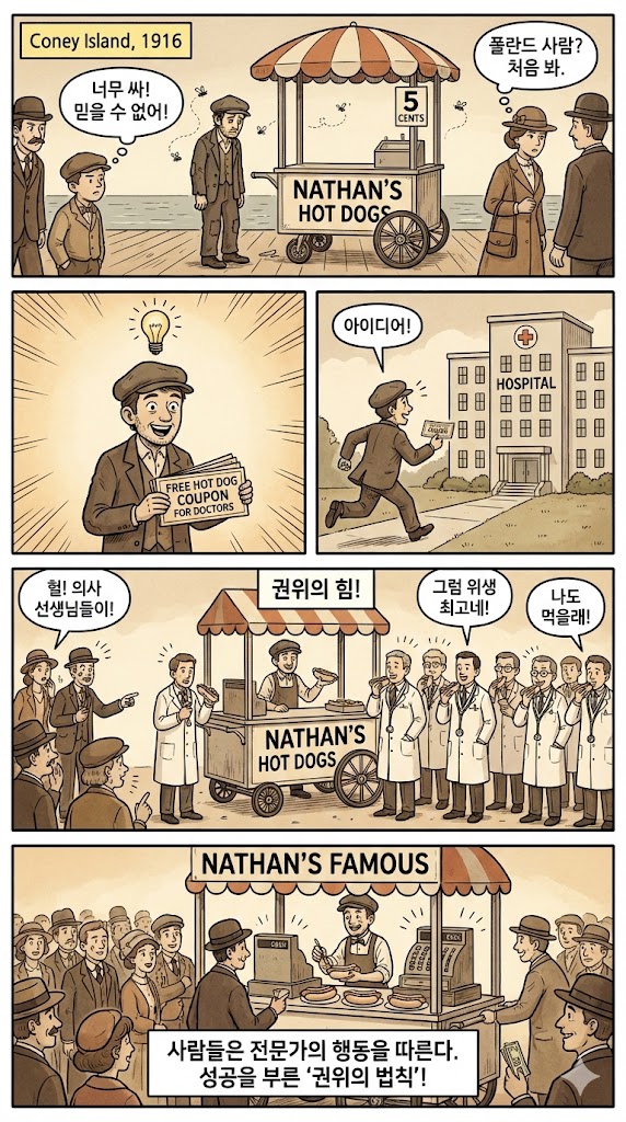 지나가던 사람들의 인식은 순식간에 바뀌었습니다. "위생에 까다로운 의사들이 먹는 걸 보니, 저 핫도그는 진짜 믿을 만한가 봐!" 의사라는 '권위'에 편승한 이 전략 덕분에 네이선스 핫도그는 대성공을 거두었고, 훗날 핫도그 먹기 세계대회를 개최하는 전설적인 브랜드가 되었습니다.