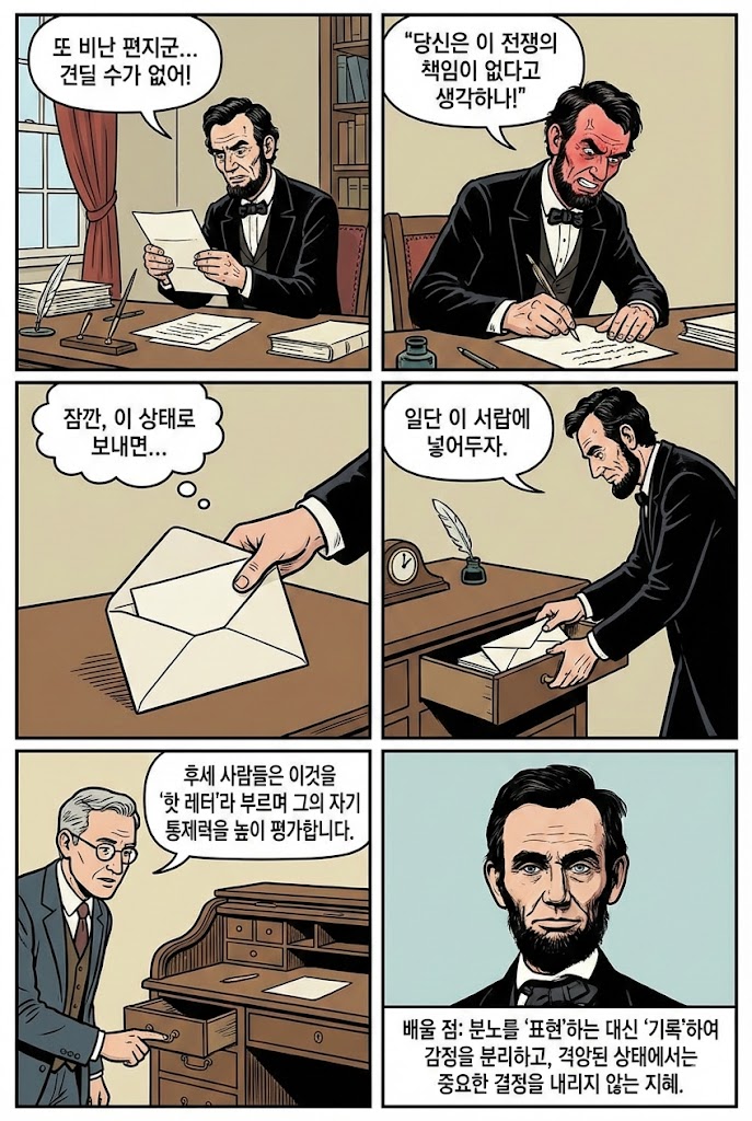 링컨 대통령은 남북전쟁이라는 극한의 스트레스 상황에서도 감정 통제력이 뛰어났습니다. 그를 비난하고 모욕하는 편지에 격분하여 답장을 쓸 때도, 그는 결코 그 편지를 부치지 않고 서랍에 넣어두었습니다. 이것을 후세의 학자들은 '핫 레터(Hot Letter)'라고 부르며, 충동적인 행동을 사전에 차단한 고도의 자기 통제력을 높이 평가합니다.