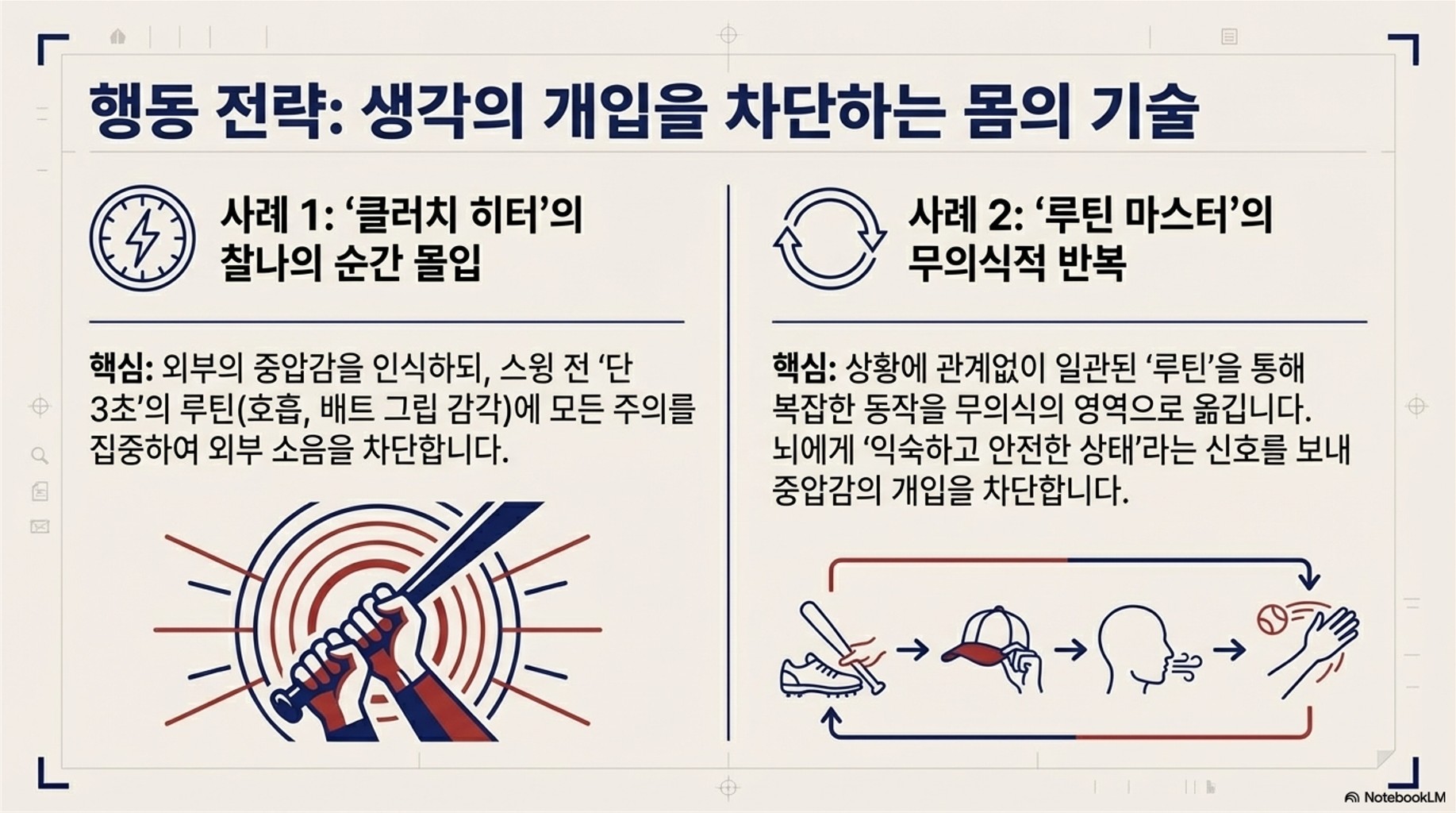 - **적용:** 만루 홈런 상황에서, 타석에 들어서는 순간부터 숨 쉬는 방식, 배트 그립을 잡는 감각 등 오직 자신의 루틴에만 몰입하여 '압박감'이 아닌 '행동' 자체에 초점을 맞춥니다.