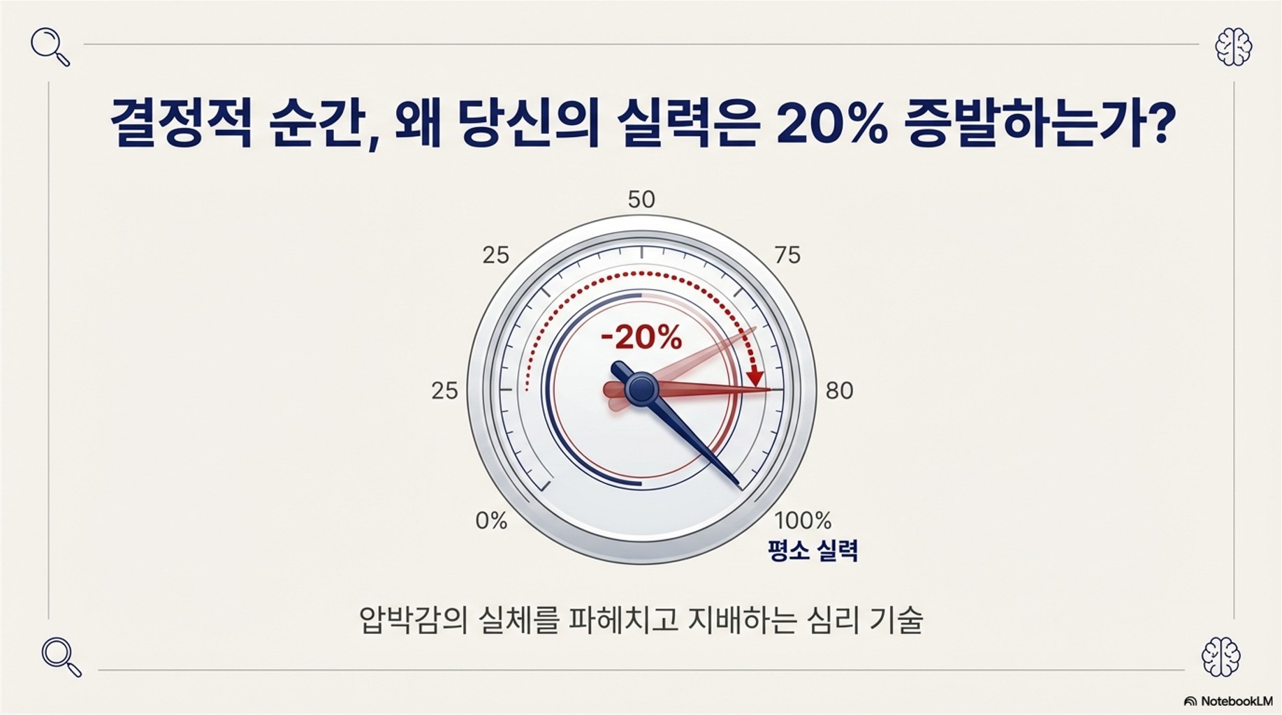 조사 결과, 프로 선수들조차 압박감이 큰 상황에서는 **평소 실력의 약 80%** 밖에 발휘하지 못했다고 해요. 즉, 심리적 압박감이 **실력의 20%**를 고스란히 갉아먹은 셈이죠. 이걸 알면 다음에 중요한 일에 실수해도 "괜찮아, 이 일로 밥 먹고사는 전문가도 20%는 깎인다잖아!" 하고 스스로를 다독일 수 있지 않을까요? 😉