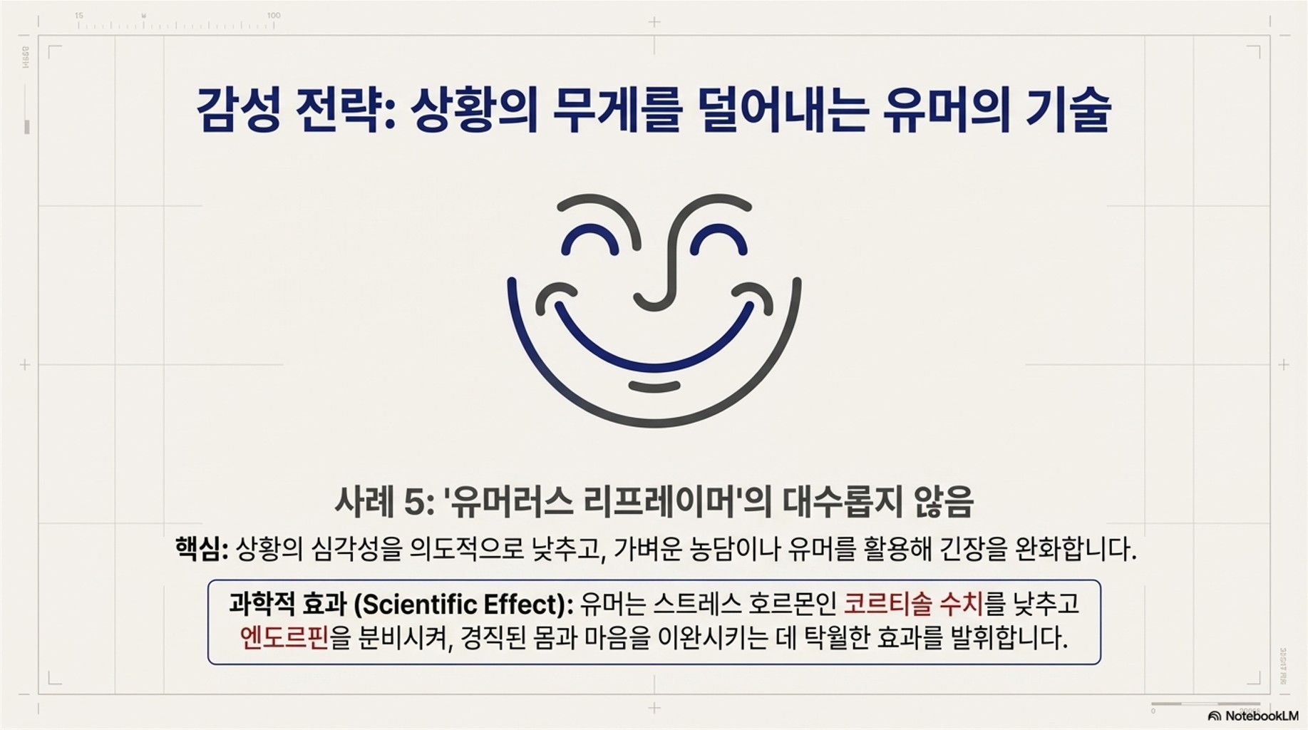 - **결과:** 유머는 스트레스 호르몬인 코르티솔 수치를 낮추고 엔도르핀을 분비시켜, 심리적 압박으로 인한 경직된 몸과 마음을 이완시키는 데 탁월한 효과를 발휘합니다.