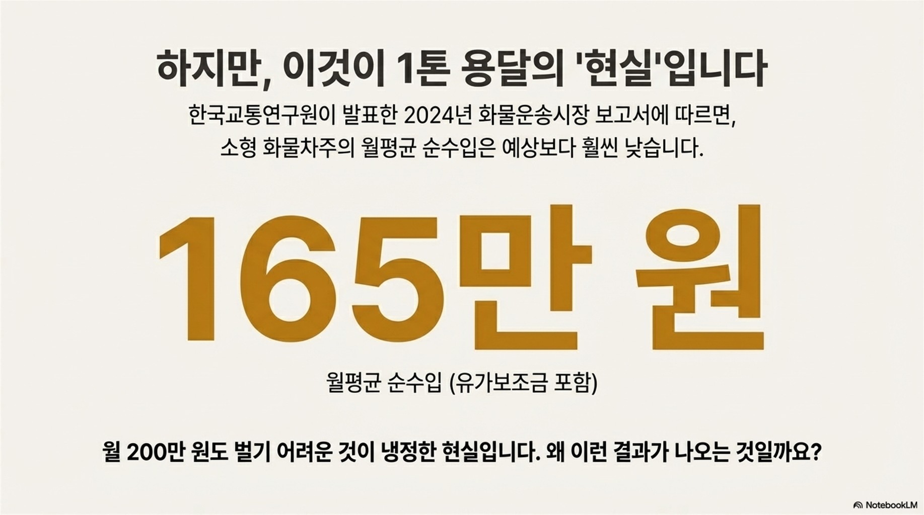 초기 비용이 적다고 해서 무턱대고 뛰어들기 전에, 현재 업계의 상황을 냉정하게 봐야 해요. 한국 교통 연구원 자료를 보면, 2024년 소형 화물차 차주의 **월평균 순수입은 165만 원**으로 조사되었는데, 이것도 유가 보조금이 포함된 금액이라고 합니다. 월 200만 원도 못 버는 게 현실인 거죠. 왜 이렇게 어려울까요?