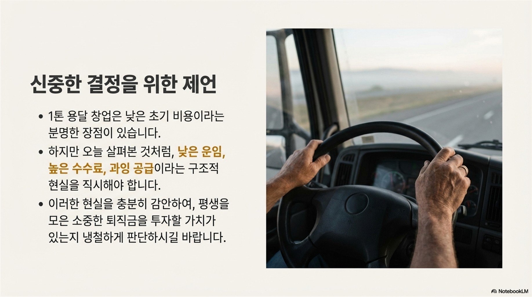 **교훈:** 화물 주선 시장의 불투명한 수수료 구조는 용달 기사의 가장 큰 고통 중 하나입니다.
