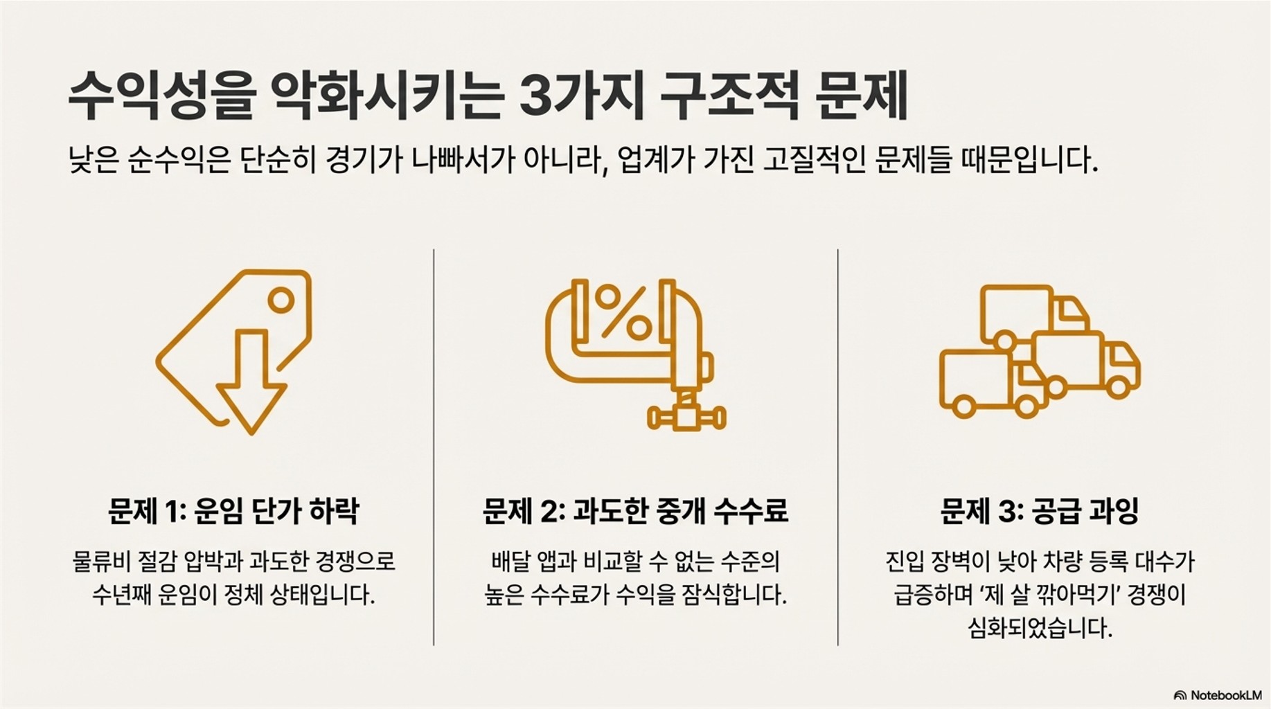 화주(물건을 보내는 업체)들은 계속해서 물류비 절감을 요구하고 있어요. 이러다 보니 기사님들이 받아가는 운임 단가는 점점 낮아지고요. 여기에 기사님들끼리도 콜을 잡으려는 경쟁이 너무 치열해져서, 울며 겨자 먹기로 낮은 가격을 수락하는 경우가 정말 많아지고 있습니다.