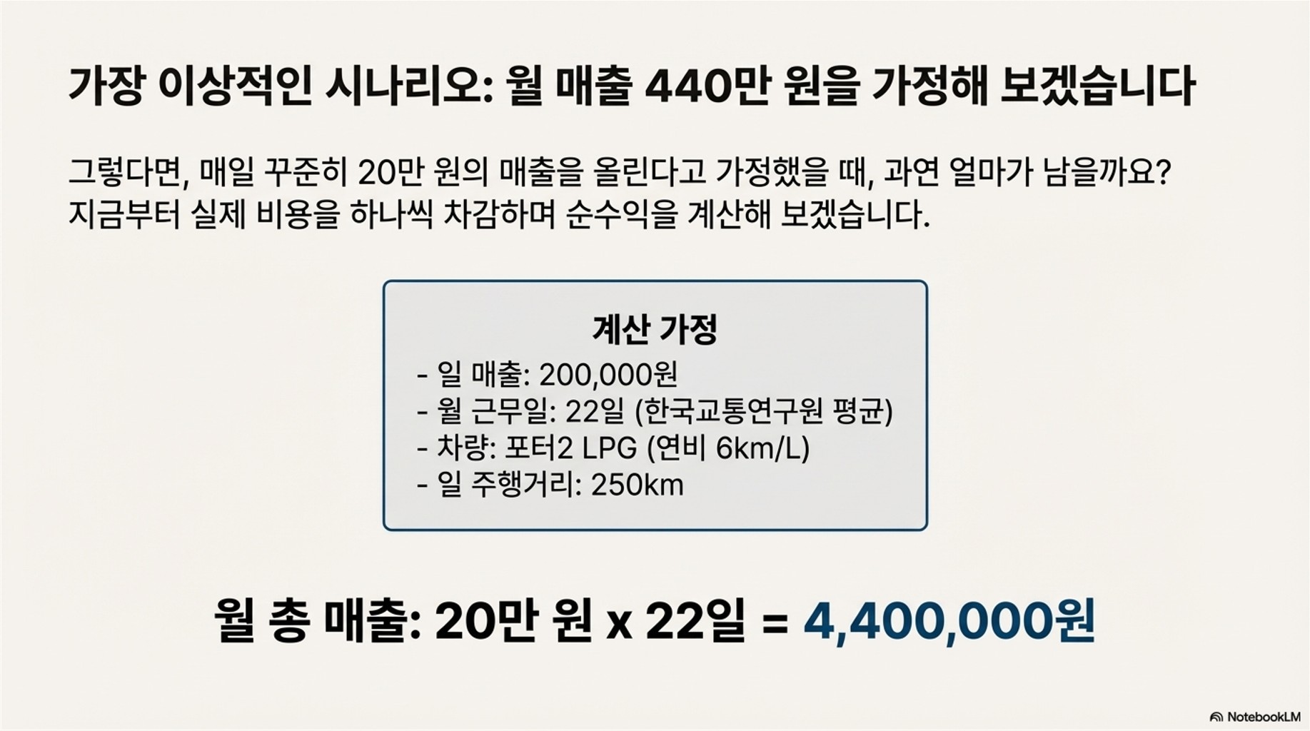 자, 그렇다면 이 어려운 현실 속에서도 **'일매출 20만 원'**을 꾸준히 찍는다고 가정하고 순수익을 계산해 보겠습니다. 물론 이 정도 매출을 내려면 정말 열심히 뛰어야 할 거예요. 한국 교통 연구원의 평균 주행 일수인 **21.71일 (약 22일)**을 기준으로 계산해 볼게요.