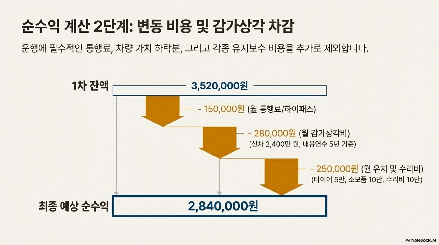 - 감가 상각비 (월): 신차 2,400만 원/5년 ÷ 12 = **28만 원**