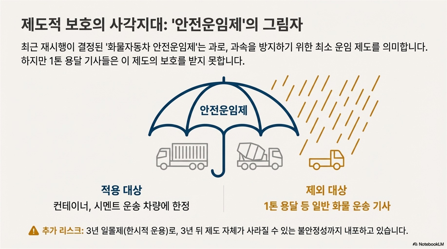 - 운임 단가와 수수료 문제: 물류비 절감 요구와 주선사의 과도한 중개 수수료(20~50%)가 기사 수입을 크게 잠식하는 구조적 문제를 안고 있습니다.