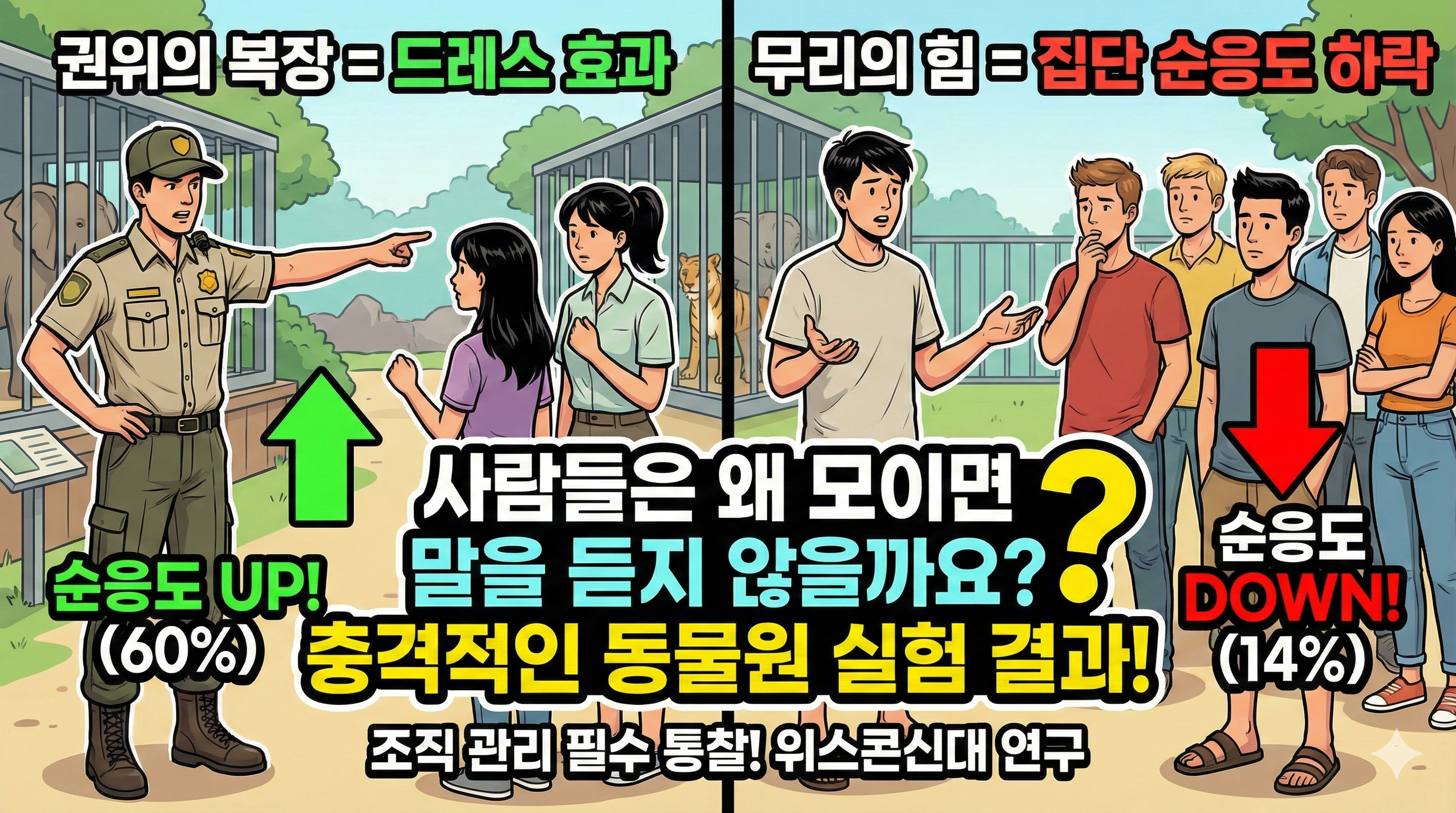 결과를 보시면, **사육사 복장**을 한 사람의 지시에 따른 관람객의 비율이 **평범한 복장**의 경우보다 약 23%p나 더 높았습니다. 옷차림이 주는 권위의 상징성이 지시 순응도에 얼마나 큰 영향을 미치는지 명확하게 보여주는 결과죠. 조직 내에서 리더의 복장이나 태도가 중요한 이유도 여기에 있습니다.