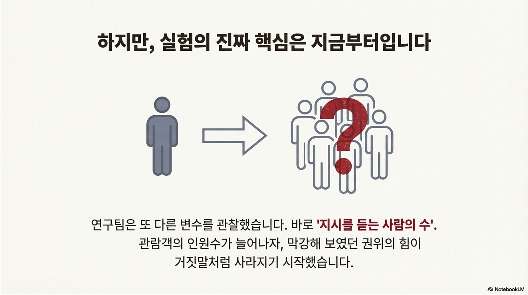 자, 이제 이 실험의 **진짜 핵심 결과**를 이야기해볼 차례예요. 연구팀은 복장의 영향 외에, **'관람객의 인원수'**에 따른 지시 순응도의 차이도 함께 조사했습니다. 이 결과가 바로 우리가 일상생활에서 겪는 **"사람이 많아지면 말을 안 듣는다"**는 현상을 심리학적으로 설명해주는 중요한 근거가 됩니다.