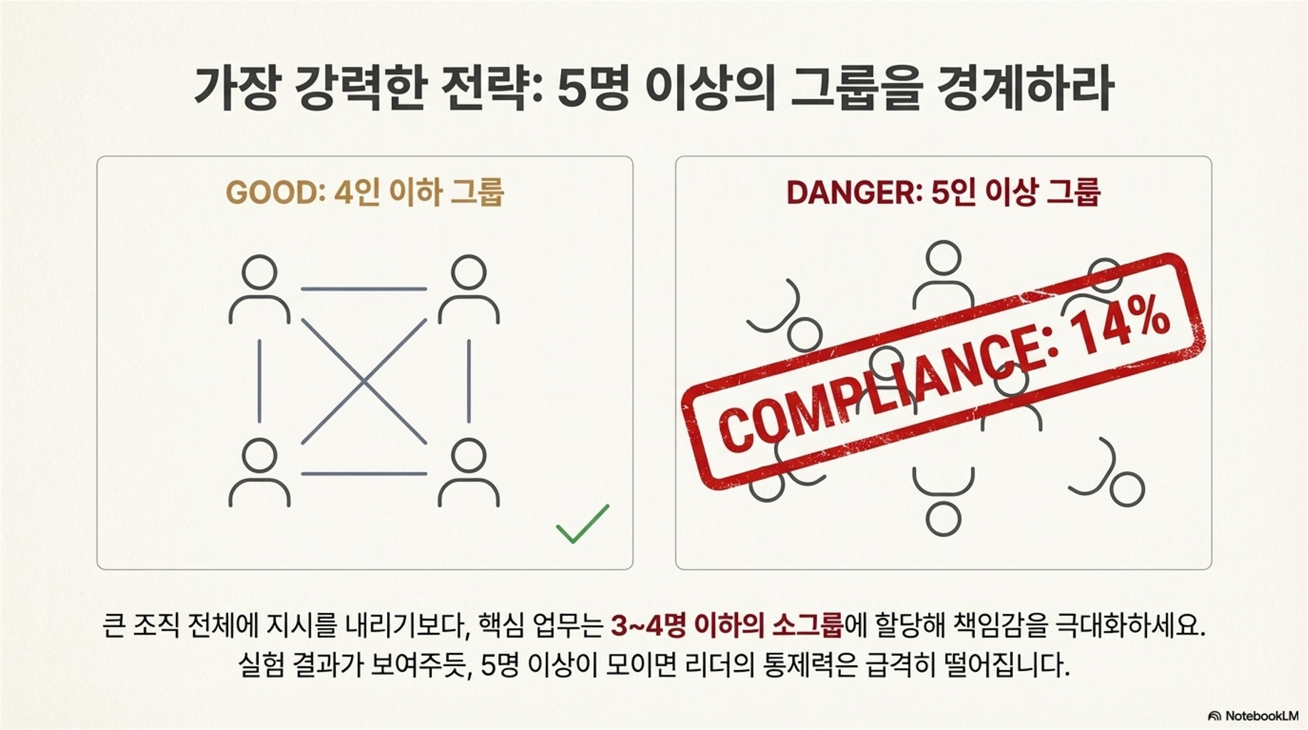 - 소그룹화 전략 (조직):큰 조직 전체에 지시를 내리기보다는, 지시가 효과적으로 수행되어야 하는 핵심 업무는 **3~4명 이하의 소그룹**에 할당하여 책임감을 극대화하세요. 5명 이상의 그룹은 통제력이 급격히 떨어진다는 점을 항상 염두에 두어야 합니다.