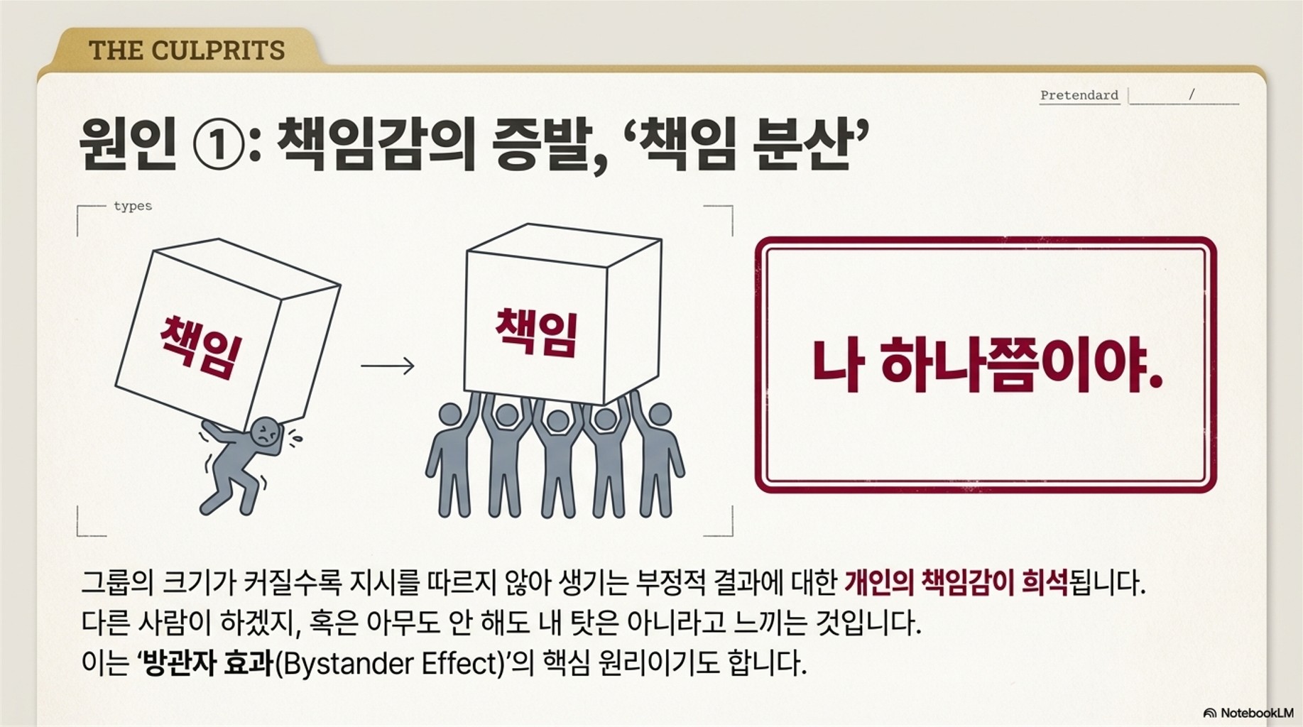 - 규범의 명확화 (집단):팀 프로젝트나 회의를 진행할 때, **'책임 소재를 명확히'** 해야 합니다. "누가 이 부분을 맡았죠?", "각자의 역할은 무엇인가요?" 등 개인의 역할을 끊임없이 상기시켜 책임 분산을 막는 것이 중요해요.