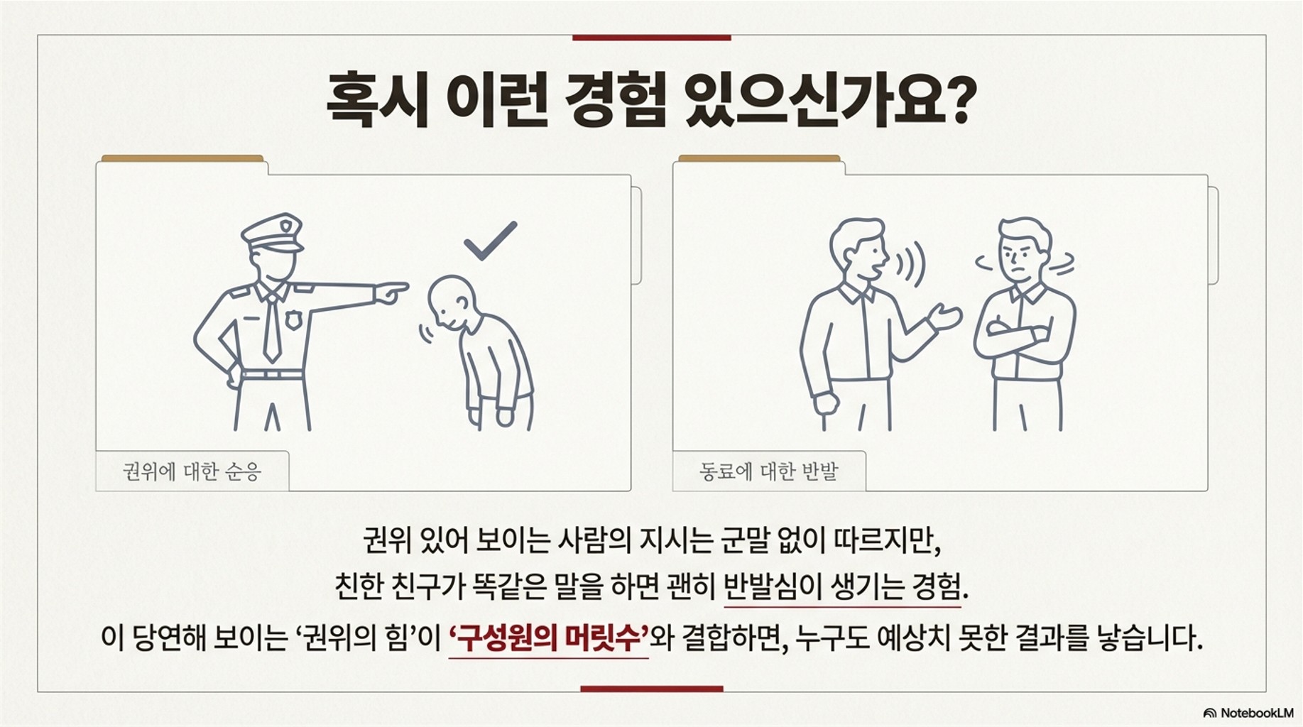 혹시 이런 경험 있으신가요? 학교 다닐 때나 회사에서, 누가 봐도 권위 있어 보이는 사람이 지시하면 군말 없이 따르게 되는데, 친한 친구나 후배가 똑같은 말을 하면 괜히 반발심이 생기거나 설렁설렁 듣게 되는 거요. 저만 그런 건 아닐 거예요. 😊 심리학에서는 이걸 두고 **권위의 힘**이라고 설명하는데요, 흥미롭게도 이 권위의 힘이 **'구성원의 머릿수'**와 결합하면 예상치 못한 결과를 낳는다고 합니다.