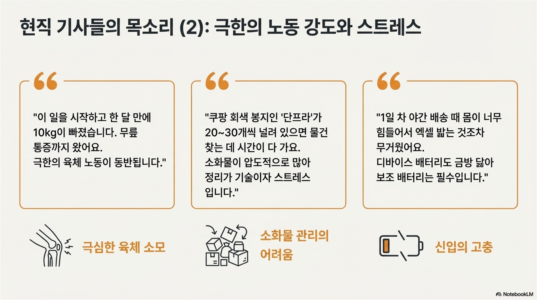 - 실질적 노동 강도: 회수 후 캠프에서 바코드 스캔 및 적재 작업까지 담당해야 합니다.