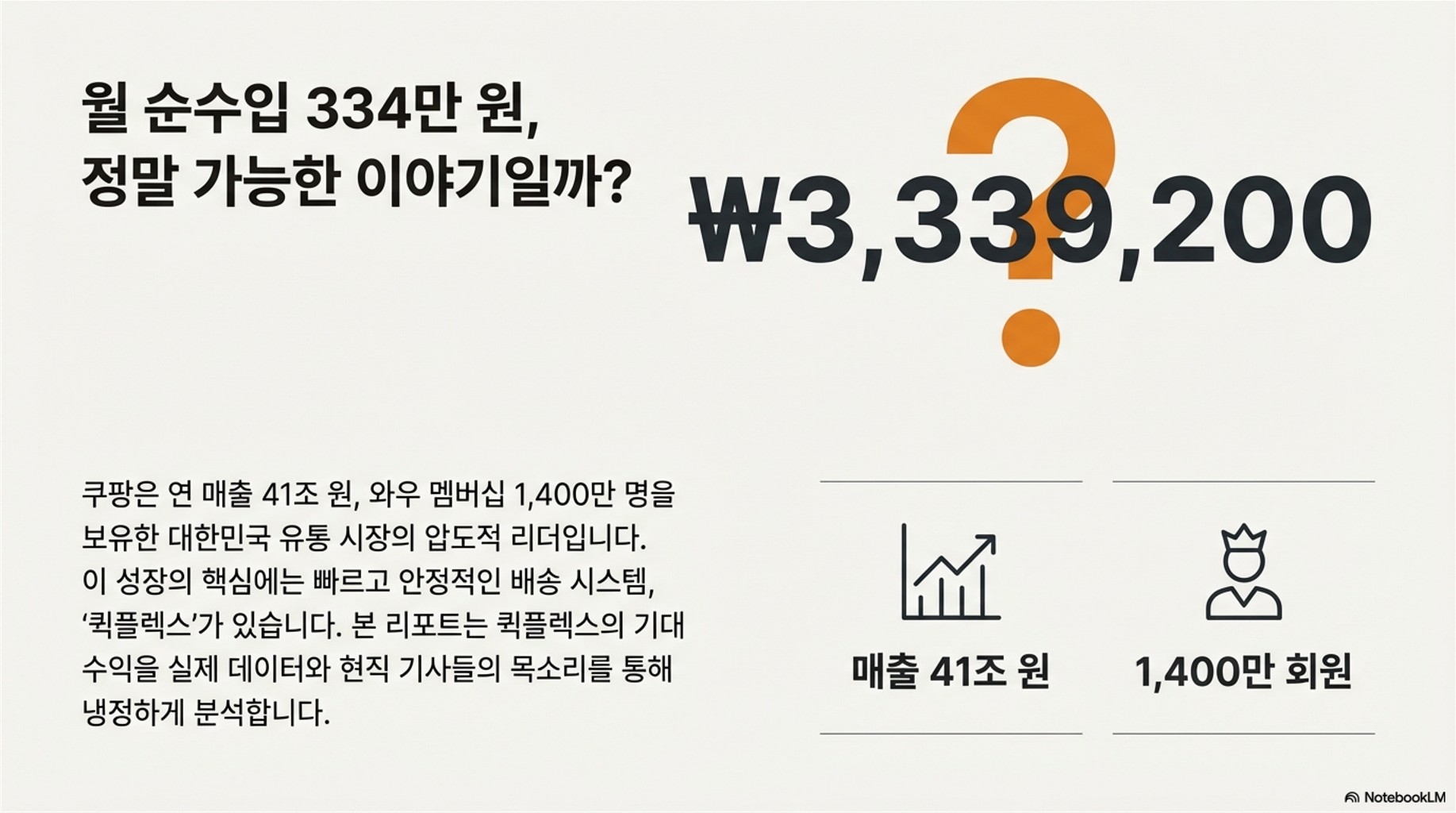쿠팡 퀵플렉스는 낮은 진입 장벽과 체계적인 시스템을 바탕으로 **월 330만 원 이상의 안정적인 순수입**을 기대할 수 있는 매력적인 직업임은 분명합니다. 그러나 이는 **하루 300건 이상을 소화할 수 있는 강력한 체력과 효율적인 배송 루트 관리 능력**을 전제로 합니다.