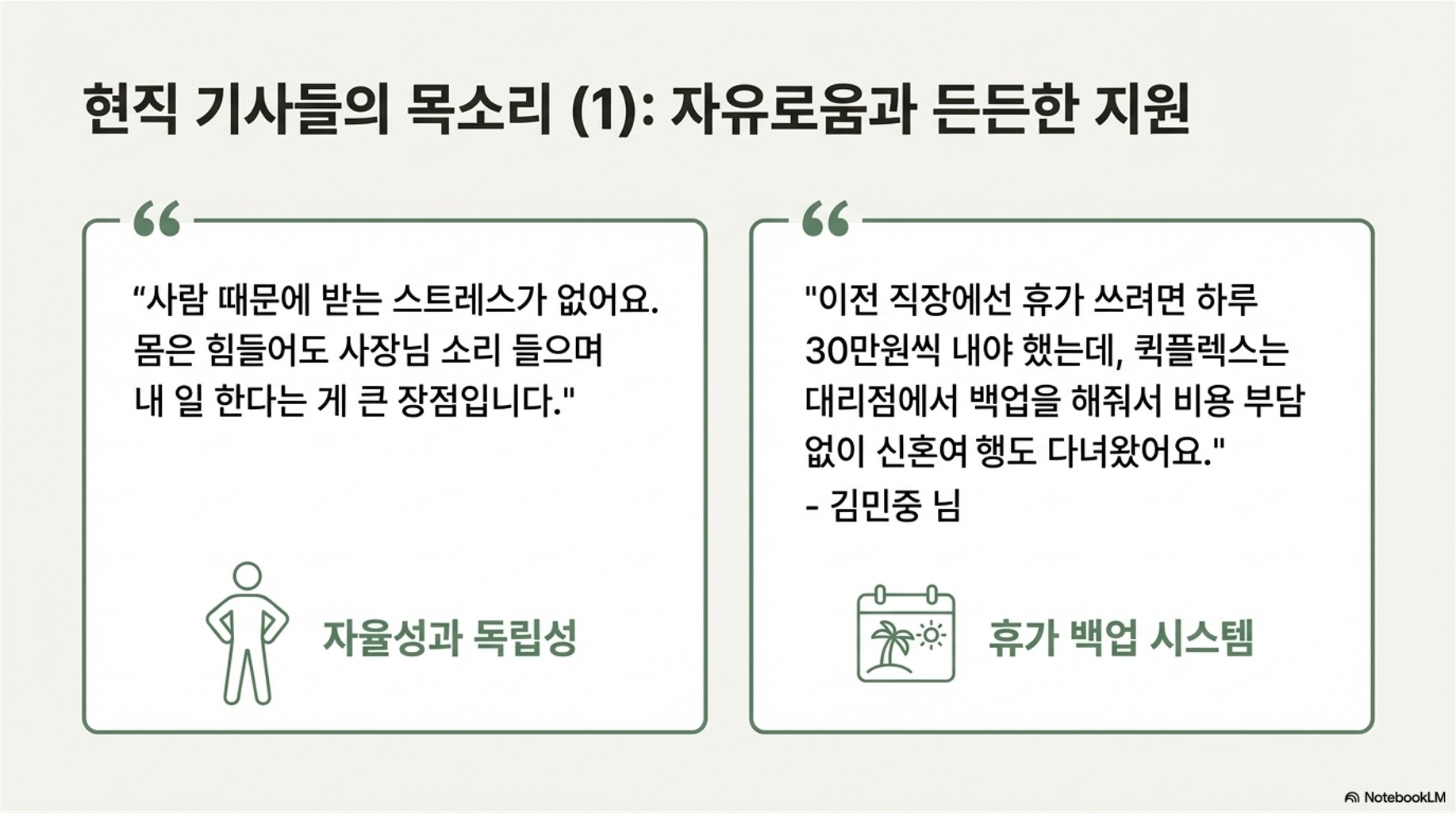 "이전 직장에선 휴가 쓰려면 하루 30만원 가까운 대리 인력 비용을 내야 했는데, 퀵플렉스는 대리점에서 알아서 백업을 해줘서 비용 부담 없이 신혼여행도 다녀왔다. 이게 가장 큰 장점이다." (퀵플렉서 김민중 님 사례)
