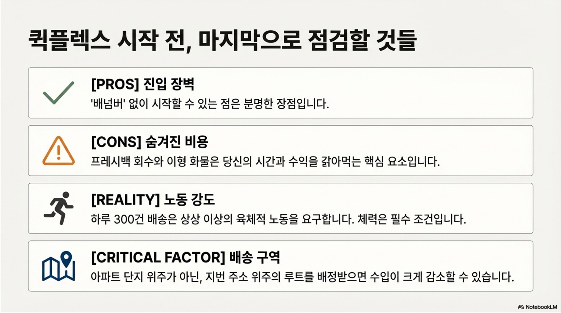 퀵플렉스를 고려한다면, 계산된 순수입 외에 **프레시백 회수 및 이형 화물로 인한 낮은 시급 문제**와 **높은 육체적 노동 강도**를 반드시 고려해야 합니다. 특히, 아파트 단지가 아닌 지번 주소 위주의 루트를 배정받게 된다면 물량 소화가 어려워 순수입이 크게 줄어들 수 있다는 점을 명심해야 합니다.