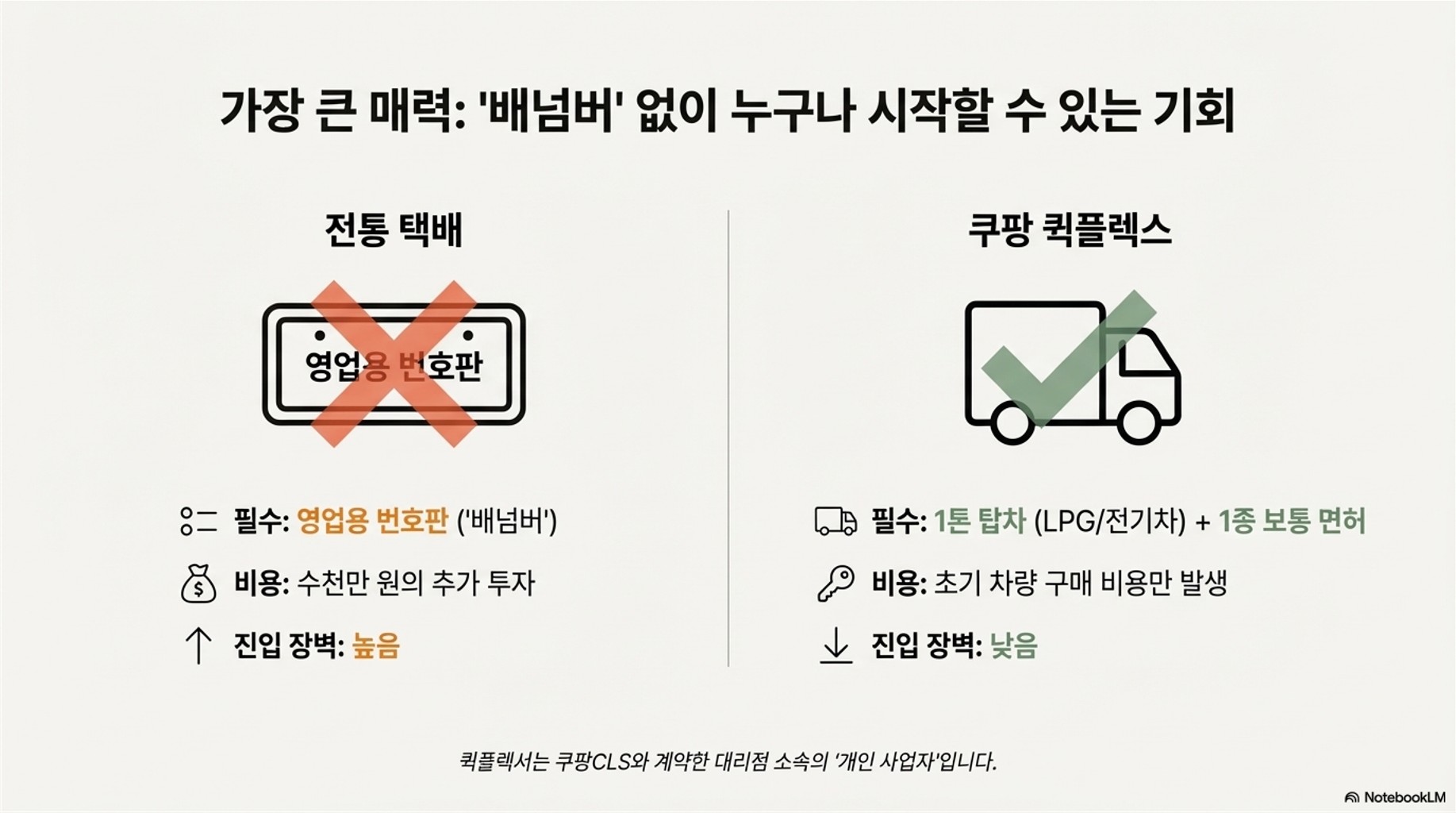 퀵플렉스의 가장 큰 장점은 **'차량과 운전면허'**만 있으면 시작할 수 있다는 점입니다. 기존 택배는 수천만 원을 호가하는 영업용 번호판(배넘버)이 필수였지만, 퀵플렉스는 이 장벽을 없앴습니다. 주로 1톤 **LPG 또는 전기 탑차(Top-van)**가 권장되며, 초기 차량 구매 비용(LPG 2,700~2,800만 원, 전기차 보조금 포함 3,500만 원 내외)만 투자하면 됩니다.