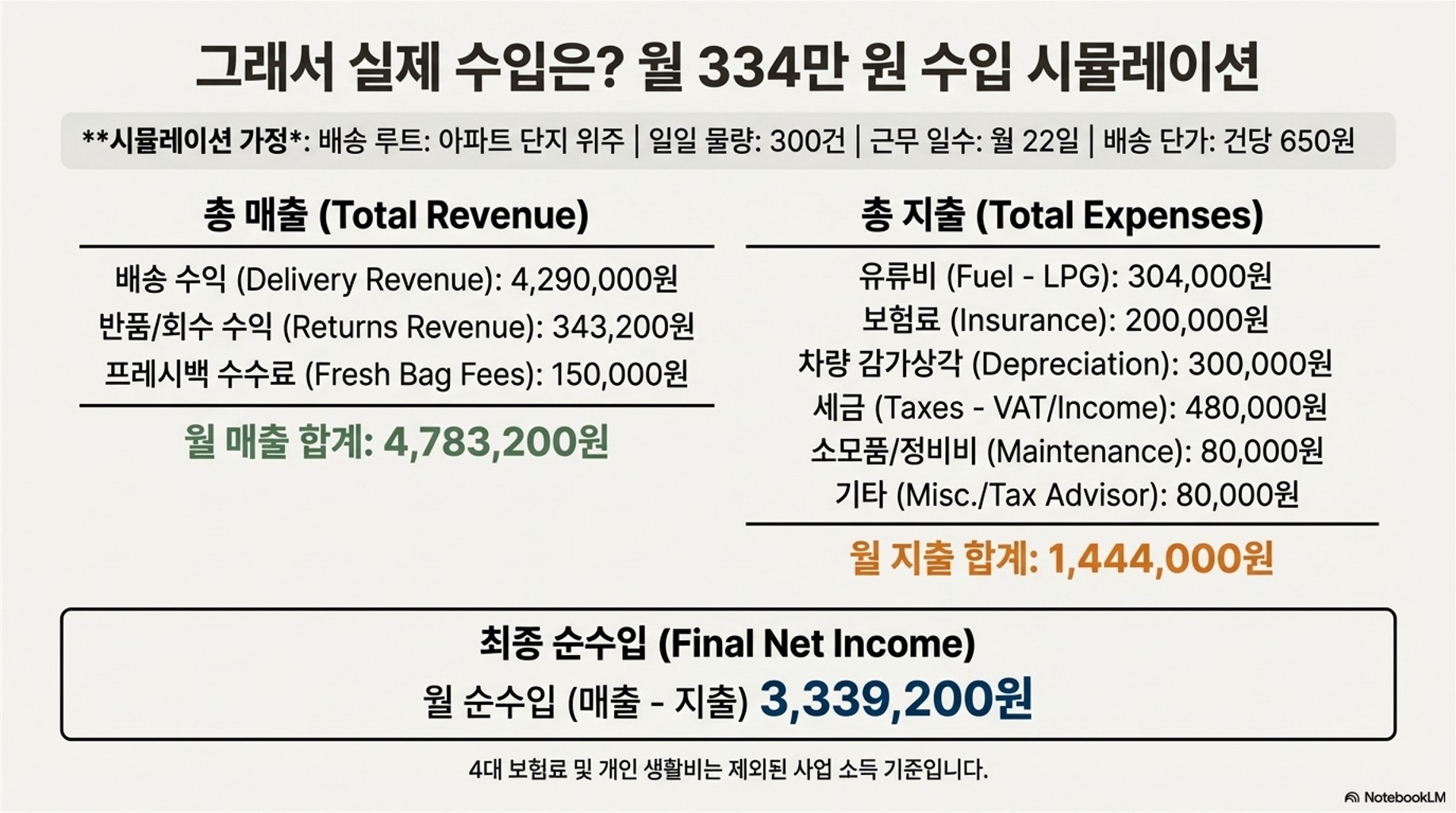 월 순수입 (세금 및 비용 공제 후): 약 334만 원