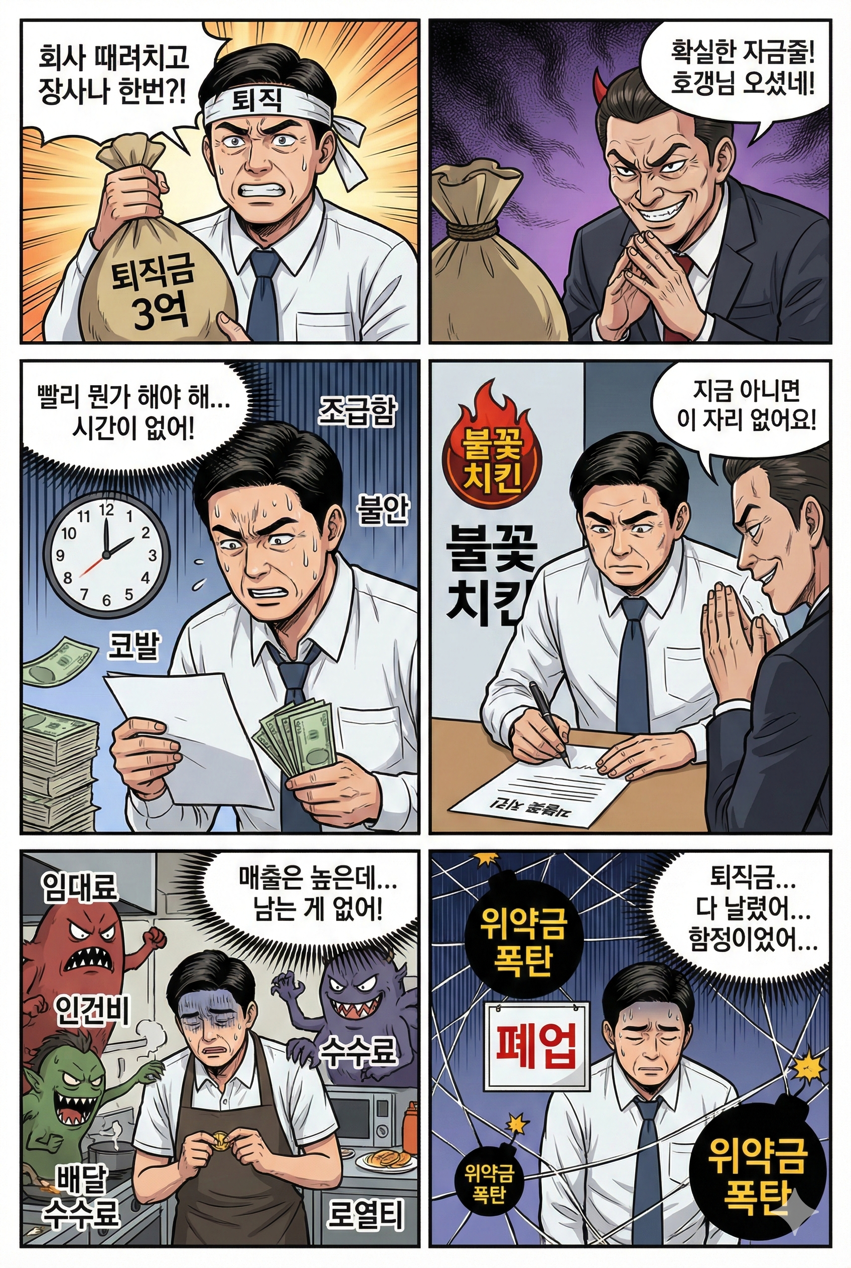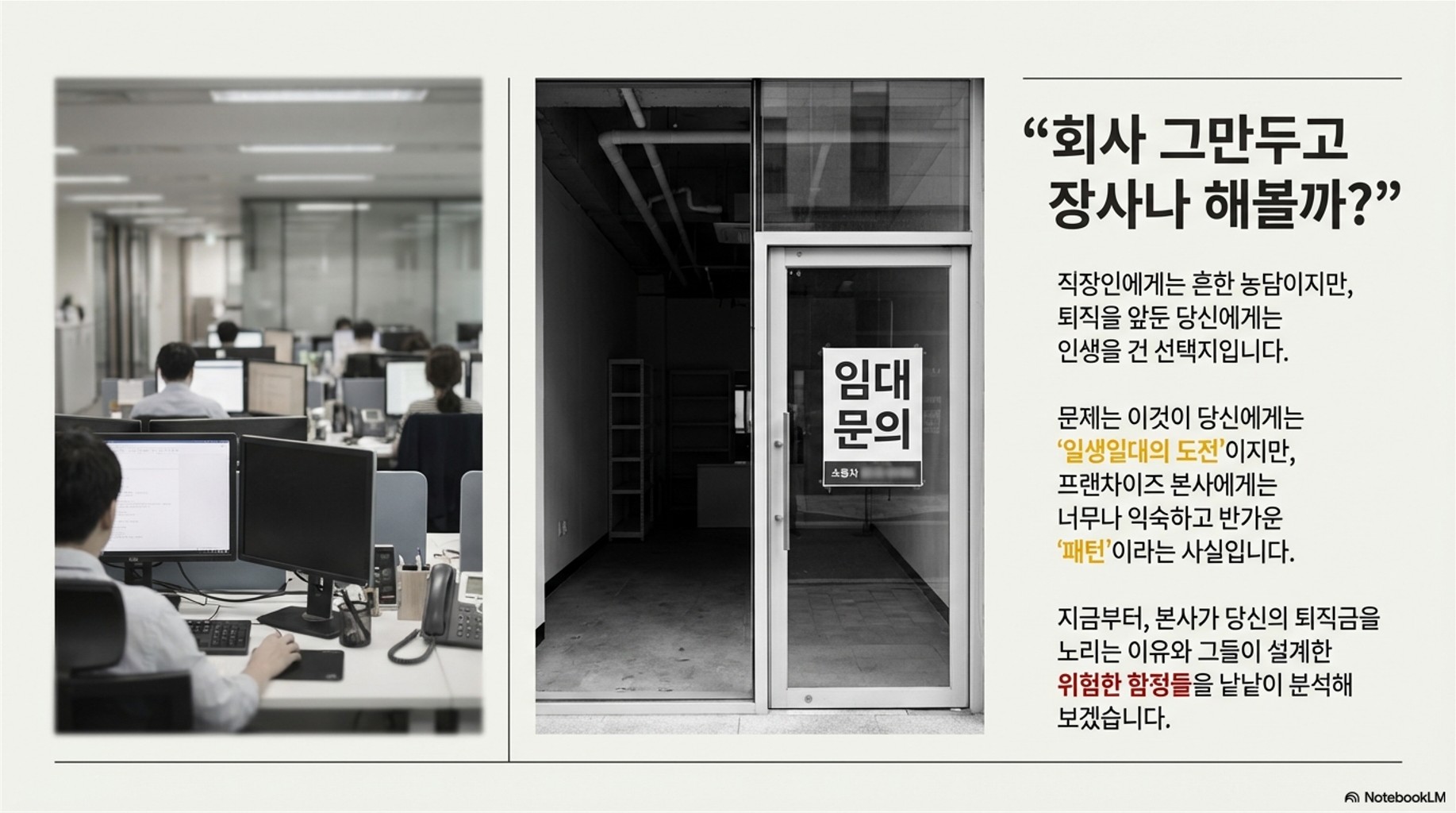 "회사 때려치고 장사나 한번 해 볼까?" 직장인이라면 누구나 한 번쯤은 농담처럼 던져본 말일 거예요. 하지만 이 말이 막상 퇴직이라는 현실과 맞닿으면 단순한 농담이 아니라 인생을 건 선택지가 됩니다. 문제는 이 선택이 퇴직자에게는 일생일대의 도전이지만, 프랜차이즈 본사 입장에서는 너무나도 익숙하고 반가운 '패턴'이라는 겁니다.