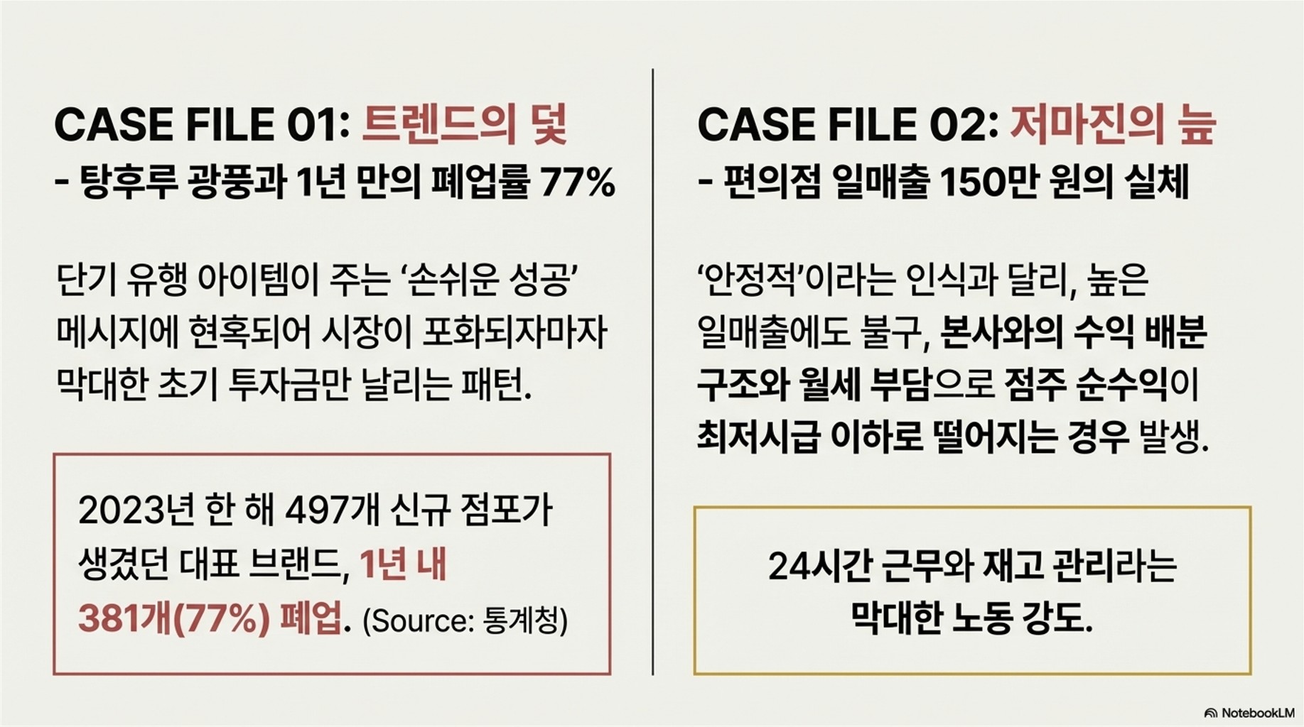재작년 탕후루 열풍이 불었을 때, 수많은 사장님이 유행만 믿고 뛰어들었습니다. 하지만 통계청 조사에 따르면, 2023년 한 해에만 497개의 신규 점포가 생겼던 대표 브랜드 중 무려 381개(77%)가 1년 만에 문을 닫았습니다. 퇴직자들은 **단기 유행 아이템**이 주는 '손쉬운 성공' 메시지에 가장 취약합니다. 결국 시장이 포화되자마자 막대한 초기 투자금만 날리게 된 거죠. - 사례 2. 편의점 일매출 150만 원의 실체 (저마진의 늪)