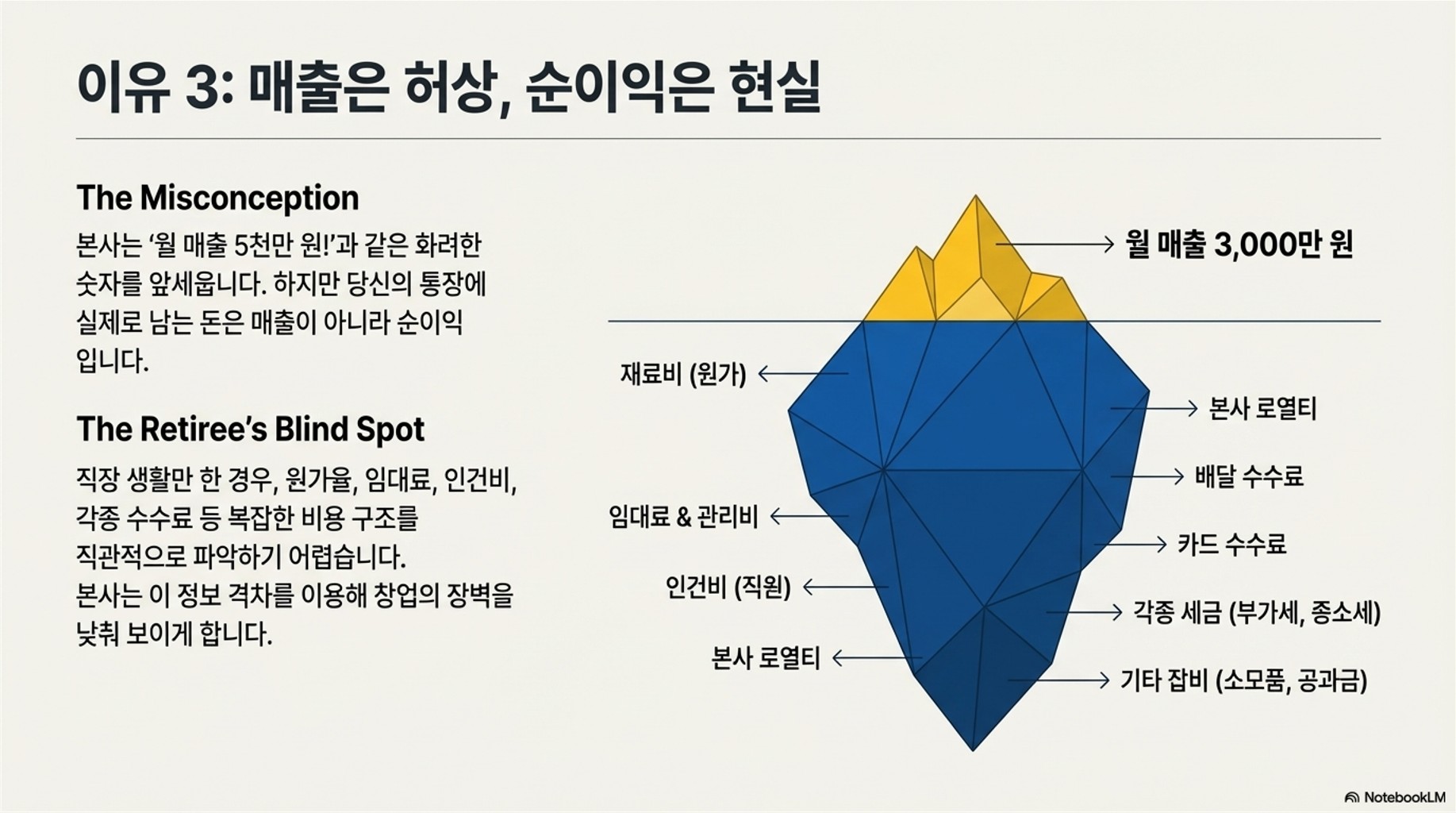 매출이 3천만 원이라고 해도 임대료, 인건비, 재료비, 각종 수수료 등을 제외하면 실제로 순이익은 100~200만 원 수준에 불과할 수 있습니다. 기존에 장사를 해본 사장님들은 이 '감'이 있지만, 직장 생활만 하던 분들은 매출과 고정비를 들어도 실제 현금 흐름을 머릿속으로 구체적으로 그리기 어렵습니다. 본사는 바로 이 점을 파고들어 창업을 훨씬 쉽게 유도할 수 있는 겁니다.