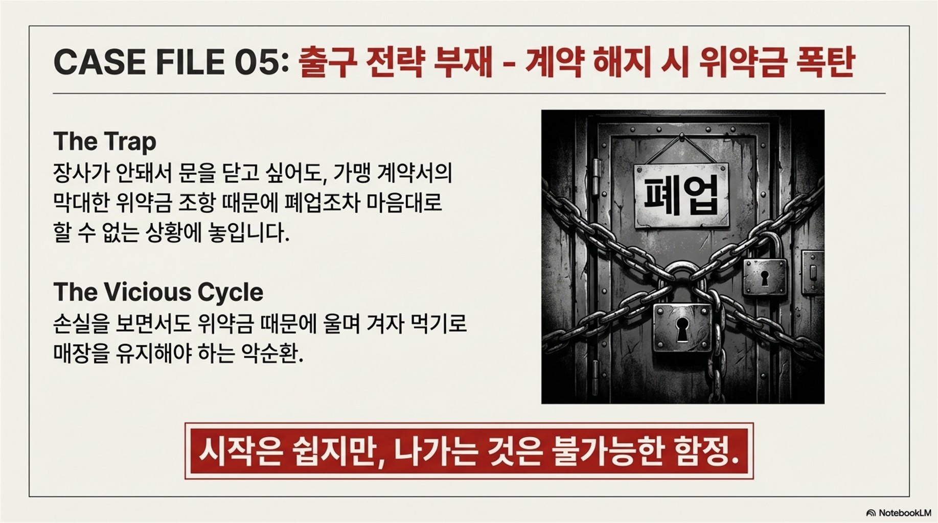 퇴직금으로 수억 원을 쏟아부은 뒤 장사가 안 되어도, 가맹 계약서에는 보통 높은 위약금 조항이 걸려 있습니다. 장사가 안 돼서 문을 닫고 싶어도, 계약 해지 시 발생하는 막대한 위약금 때문에 울며 겨자 먹기로 매장을 유지해야 하는 상황에 놓입니다. 즉, 퇴직자는 **'시작은 쉽지만, 나가는 건 불가능한'** 함정에 빠지는 것입니다.