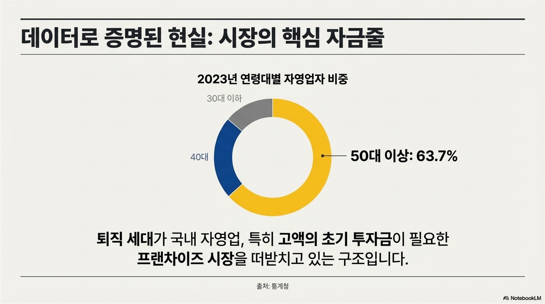 통계청 자료에 따르면, 2023년 기준 자영업자 연령대별 비중에서 **50대 이상이 무려 63.7%**로 압도적인 비율을 차지하고 있습니다. 이분들이 프랜차이즈 시장의 주요 자금줄 역할을 하고 있는 거죠. 시설 업종(스터디 카페, 키즈 카페 등)은 초기 투자비가 3~4억 이상 들어가는 경우도 흔합니다.