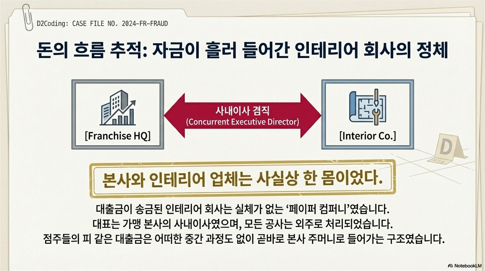 수억 원이 자동 송금된 그 인테리어 회사의 정체를 확인해보니, 역시나 충격적이었습니다. 그 인테리어 업체 대표는 바로 가맹 본사의 사내이사로 등재된 인물이었다고 합니다. 네, 맞습니다. **본사와 인테리어 업체가 한 몸**이나 다름없었던 거죠. 점주들의 피 같은 대출금은 곧바로 본사 주머니로 흘러 들어가는 구조였습니다.
