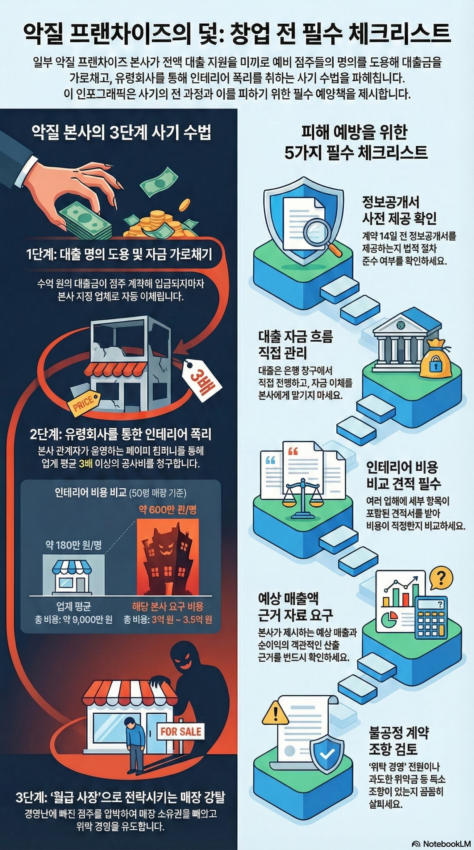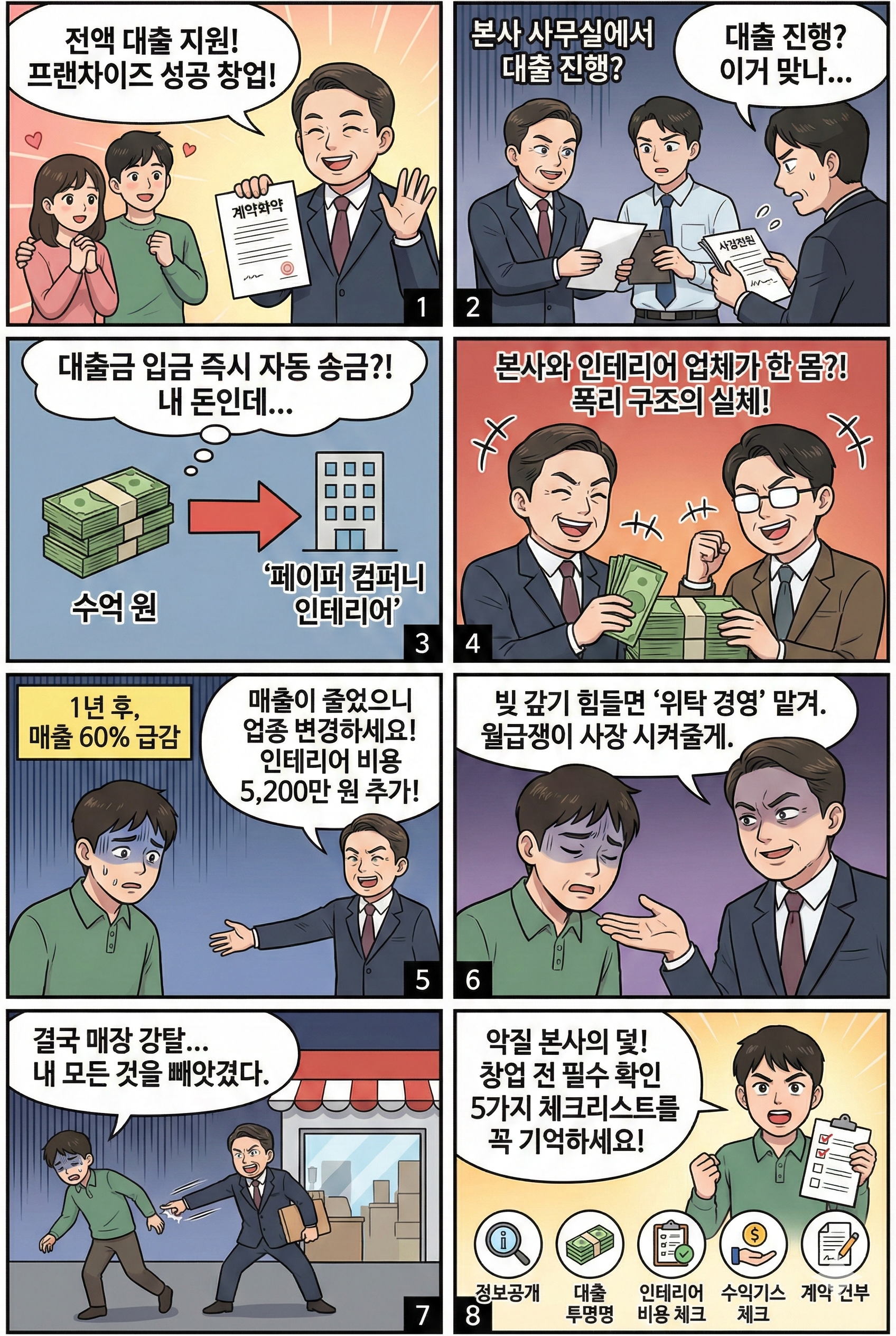 프랜차이즈 창업을 꿈꾸는 분들이라면 누구나 본사의 '전액 대출 지원'이라는 말에 혹할 수밖에 없어요. 특히 자금이 부족한 예비 점주님들에게는 정말 달콤한 유혹이죠. 하지만 제가 최근 입수한 자료를 보니까, 상상 이상으로 악질적인 수법으로 점주님들을 나락으로 빠뜨리는 본사가 존재했습니다.