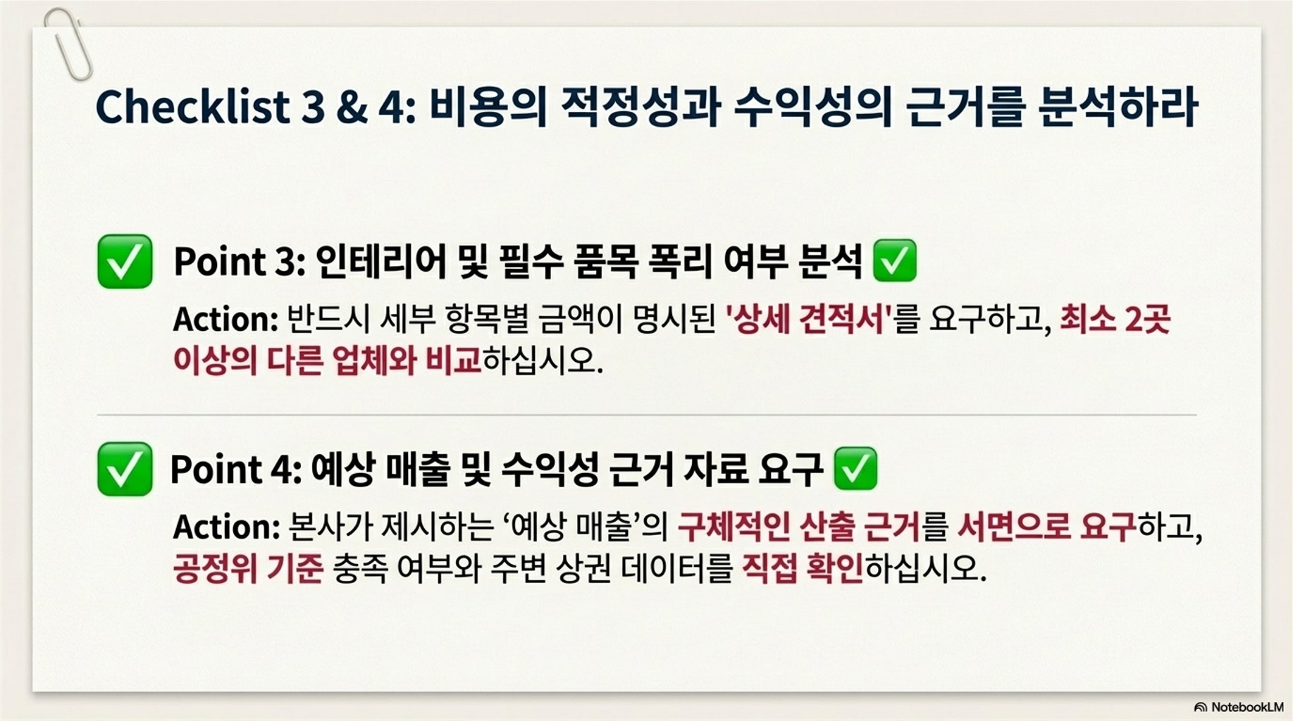 - ③ 인테리어 및 필수 품목 공급 폭리 여부 분석:인테리어 견적은 반드시 세부 항목별 금액이 명시된 견적서를 요구하고, 여러 인테리어 업체의 견적과 비교하세요. 또한, 필수 품목(집기, 5분 등)이 터무니없이 비싼 가격에 강매되는지 확인이 필요합니다.