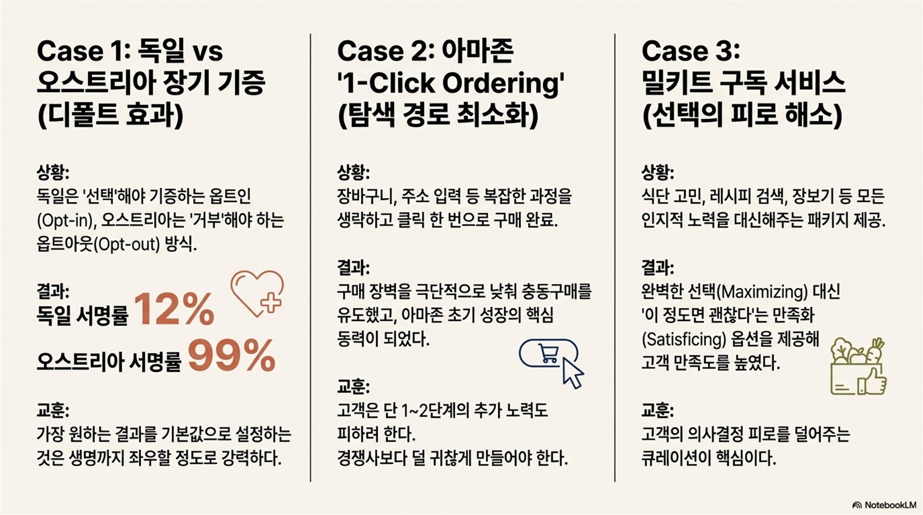 지금까지 컬럼비아대 연구 결과를 통해 우리가 얼마나 게으른 소비자인지 확인하고, 이를 활용할 마케팅 전략을 살펴봤습니다. 핵심은 다음 세 가지 키워드로 요약할 수 있습니다.
