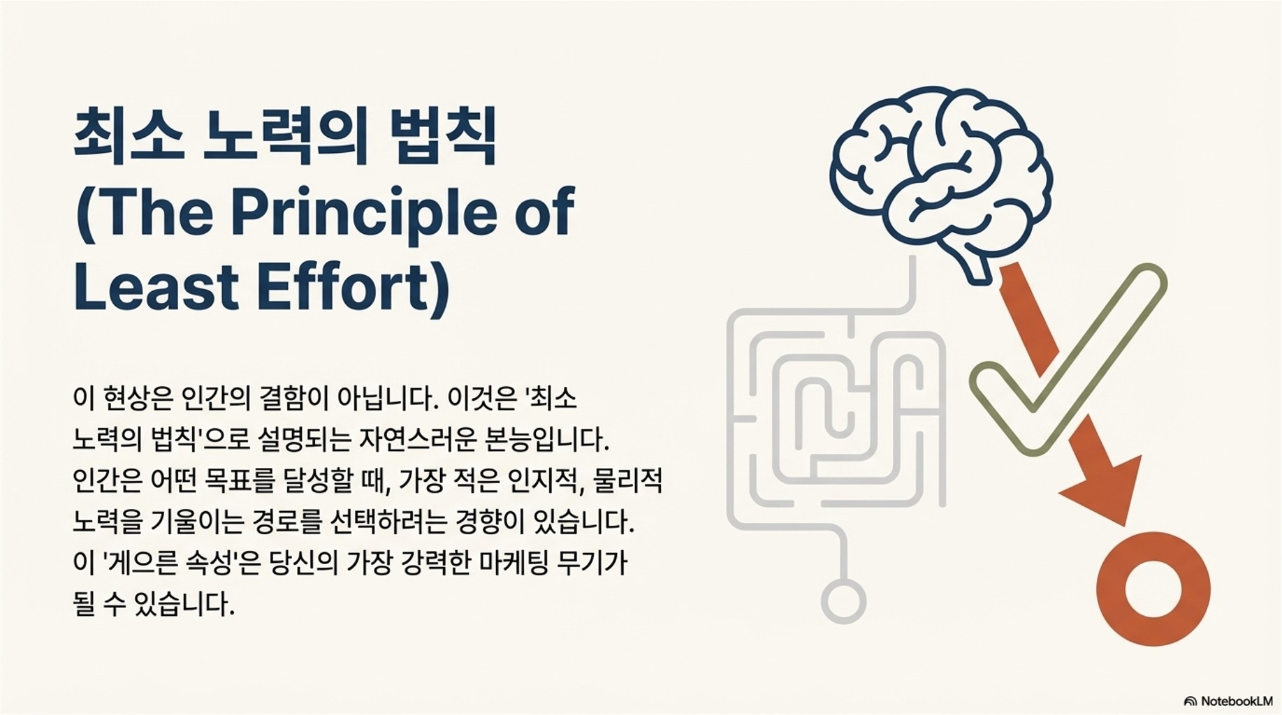 소비자들이 비교를 건너뛰는 현상은 '최소 노력의 법칙(Principle of Least Effort)'으로 설명됩니다. 인간은 어떤 목표를 달성할 때, 가장 적은 인지적 노력과 물리적 노력을 기울이는 경로를 선택하려는 경향이 있습니다. 이 '게으른 속성'은 기업의 마케팅 전략에 있어 가장 강력한 무기가 될 수 있습니다.