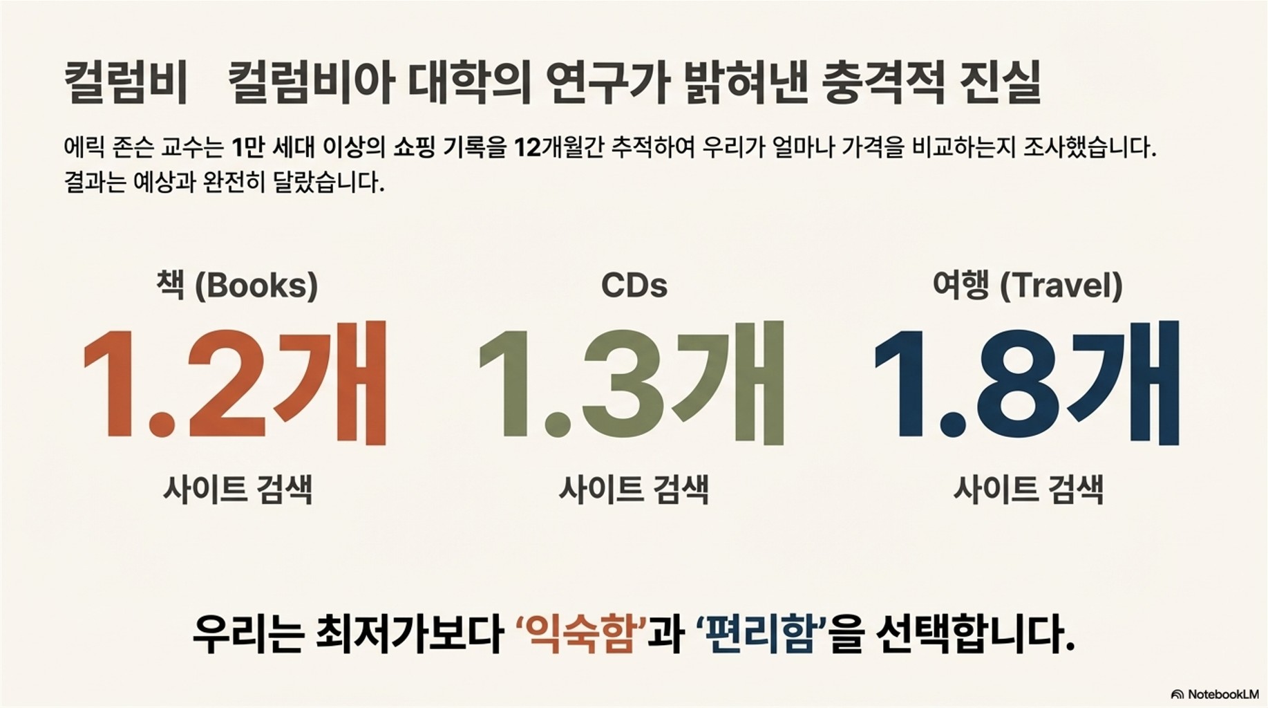 저도 이걸 보고 깜짝 놀랐어요. 특히 책은 1.2개라니! 아마존이나 반즈앤드노블처럼 익숙한 플랫폼에서 검색하고 바로 장바구니에 담아 결제까지 마치는 사람이 대다수였다고 해요. 몇 푼이라도 아끼려면 최소한 3~4개 사이트는 비교해봐야 하는 거 아닌가요? 이게 바로 **현대인의 '게으른 소비자' 본능**이 인터넷 환경에서도 여실히 드러난 증거입니다. 사람들은 시간과 노력을 들여 더 싸게 사는 것보다, 익숙하고 편리한 곳에서 대충(!) 쇼핑을 끝내는 것을 선호하는 거죠.