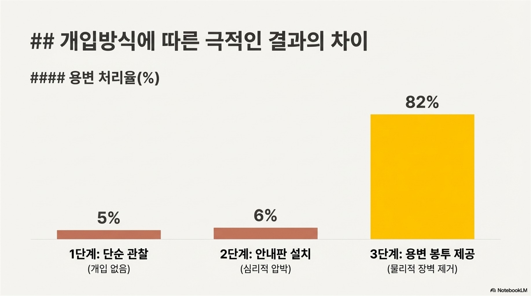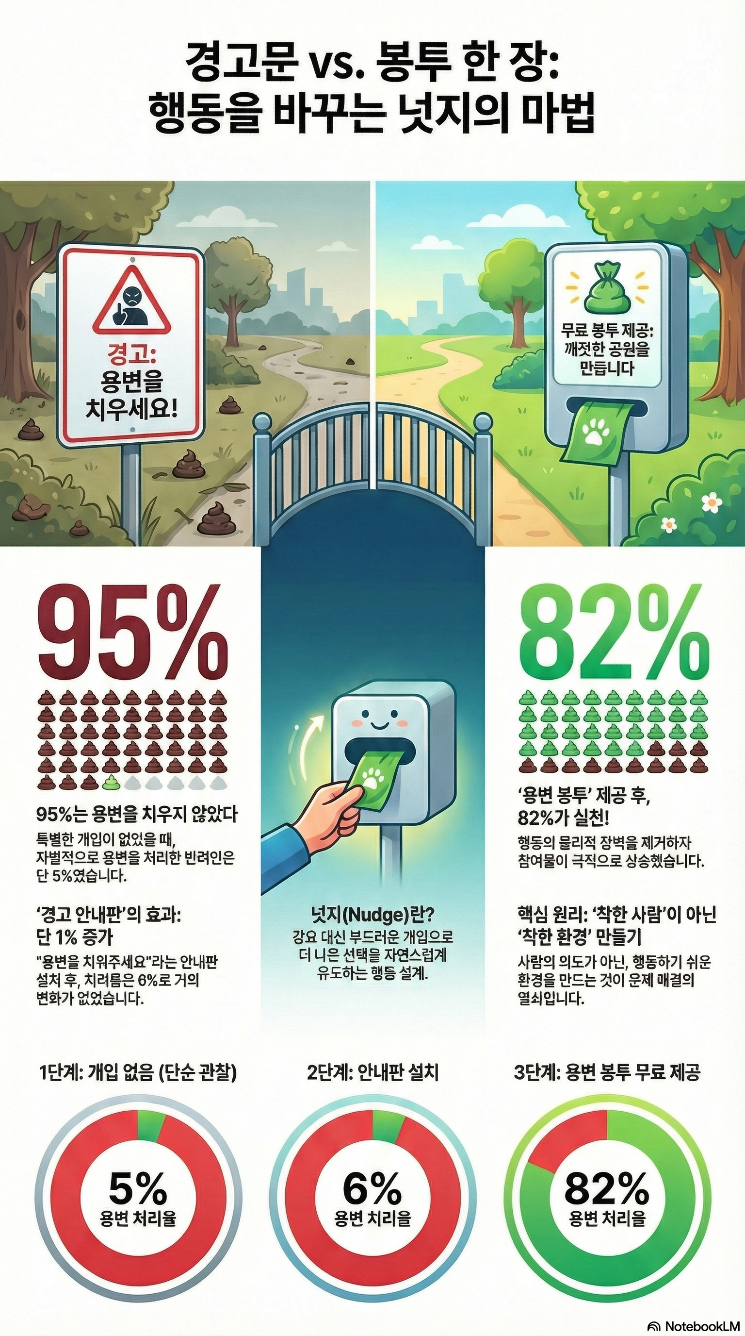 - 효과적인 개입: '경고'나 '안내판'은 효과가 미미하며, '용변 봉투 무료 제공'처럼 물리적 실천을 쉽게 만드는 도구를 제공하는 것이 압도적으로 효과적입니다.