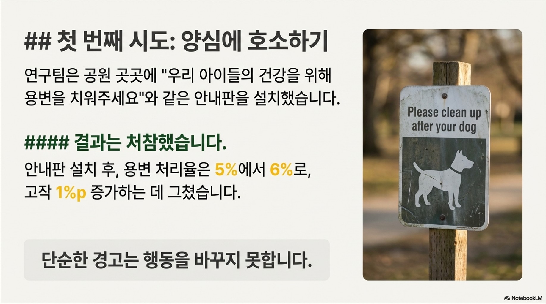 첫 번째 시도! 산책 코스 곳곳에 눈에 잘 띄는 안내판을 세웠습니다. 내용은 "우리 자녀들의 건강을 보호합시다. 무엇보다 먼저 개의 용변을 치워주십시오."와 같은 공익 광고 스타일이었죠. 7일간 이 안내판을 설치한 후 다시 관찰했더니, 결과는 어땠을까요? 유감스럽게도 안내판 설치 전과 거의 차이가 없었습니다. 청소율은 단 6%. 1% 증가에 불과했죠.