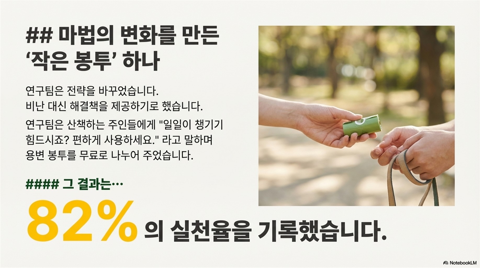 95%의 무관심이 82%의 적극적인 실천으로 바뀐 겁니다. 정말 놀라운 변화 아닌가요? 이 연구는 사람들이 올바른 행동을 하지 않는 이유가 '나쁜 의도' 때문이 아니라, '실천하기 귀찮거나 필요한 도구가 없어서'라는 것을 명확히 보여줍니다. 봉투를 제공하는 순간, 용변을 치우는 행위의 '물리적 장벽'이 사라진 거죠.
