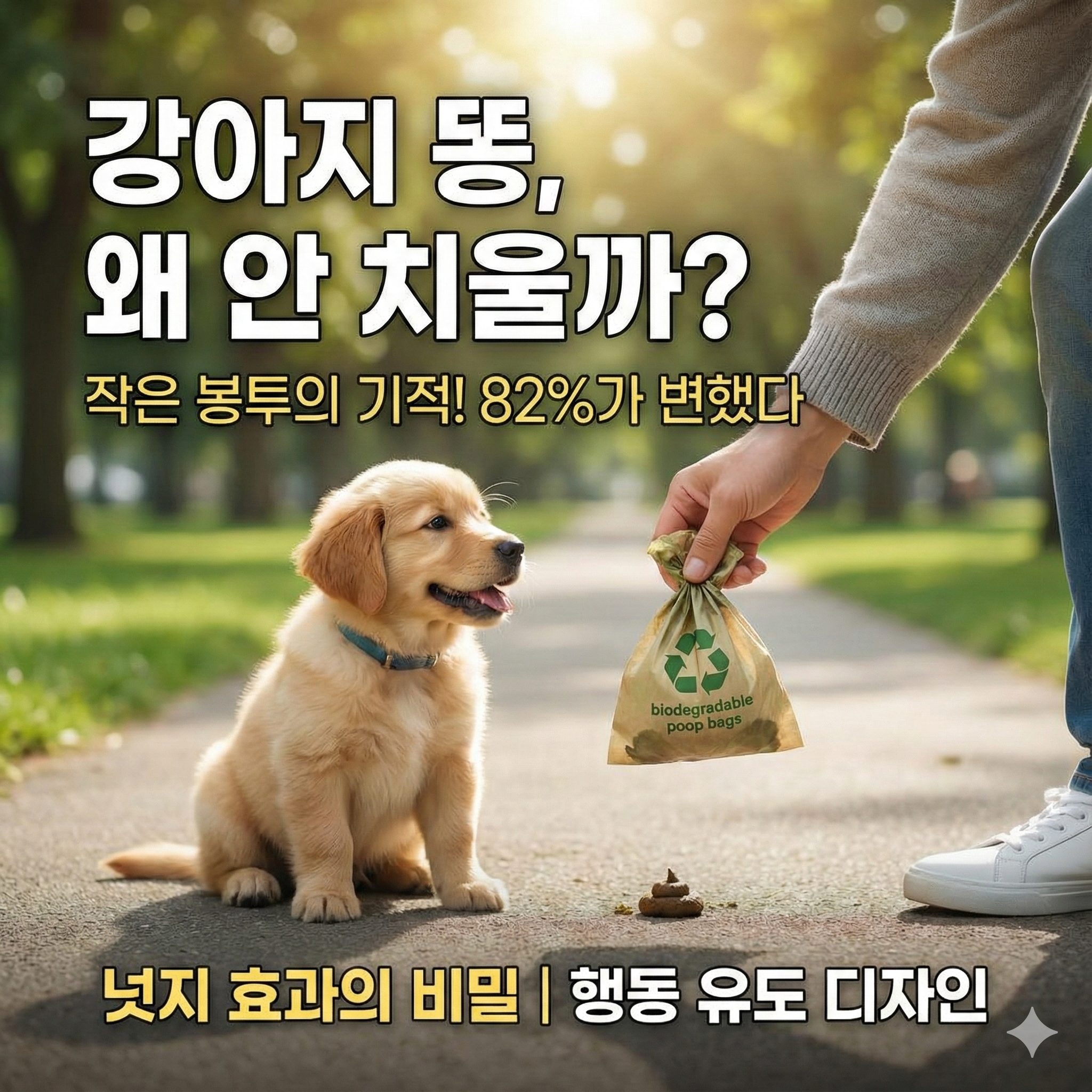- 봉투 스테이션 설치 (제이슨 교수법): 산책로 입구나 벤치 근처 등 접근성이 좋은 곳에 용변 봉투와 쓰레기통을 결합한 '펫티켓 스테이션'을 설치하여 물리적인 제약을 제거합니다.