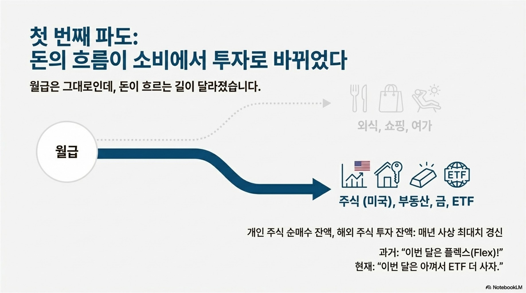 | **돈의 흐름** | 외식, 여가 등 일상 소비 | **자산 (주식, 부동산, 금, ETF)** |