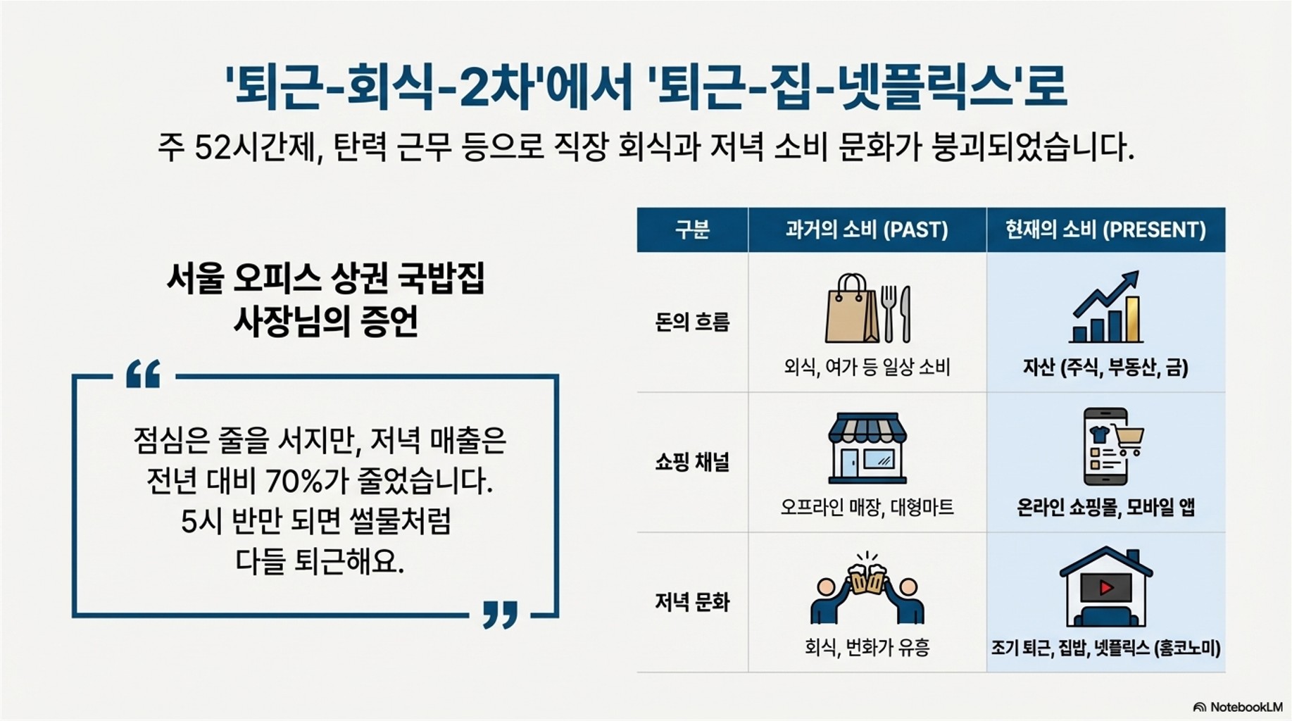 | **저녁 문화** | 회식, 번화가 유흥 | **조기 퇴근, 집밥, 넷플릭스 (홈코노미)** |