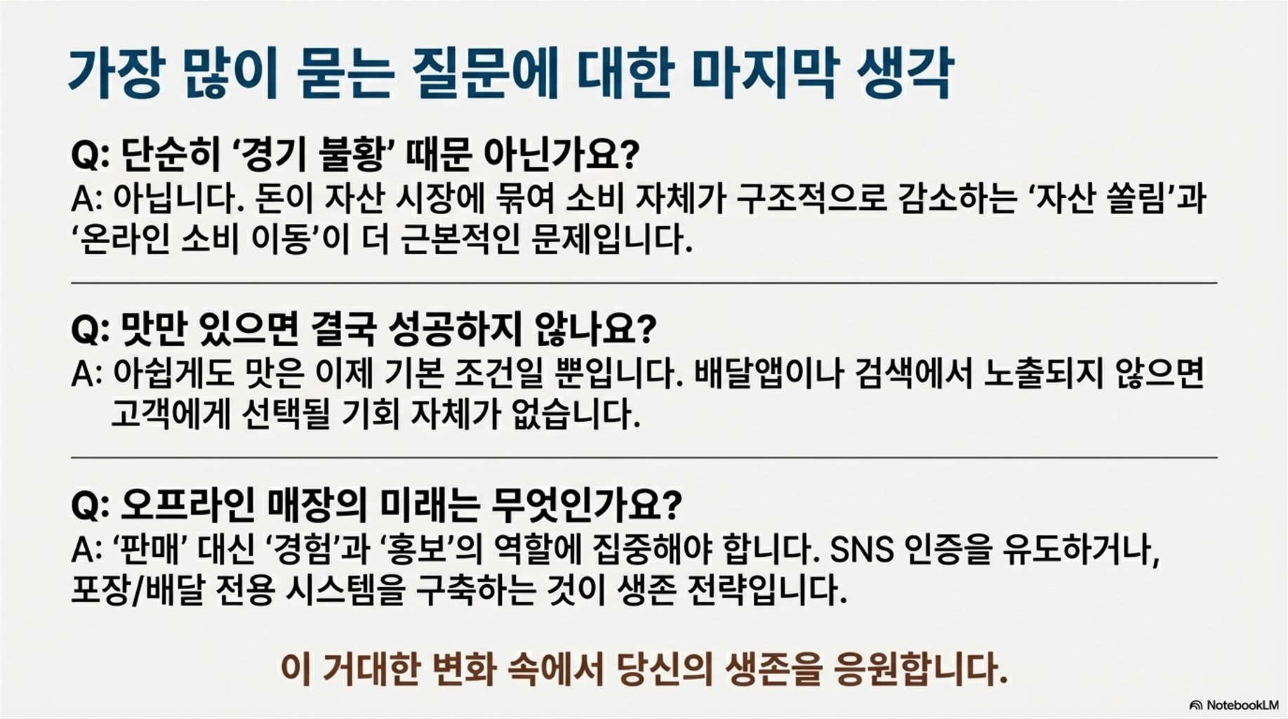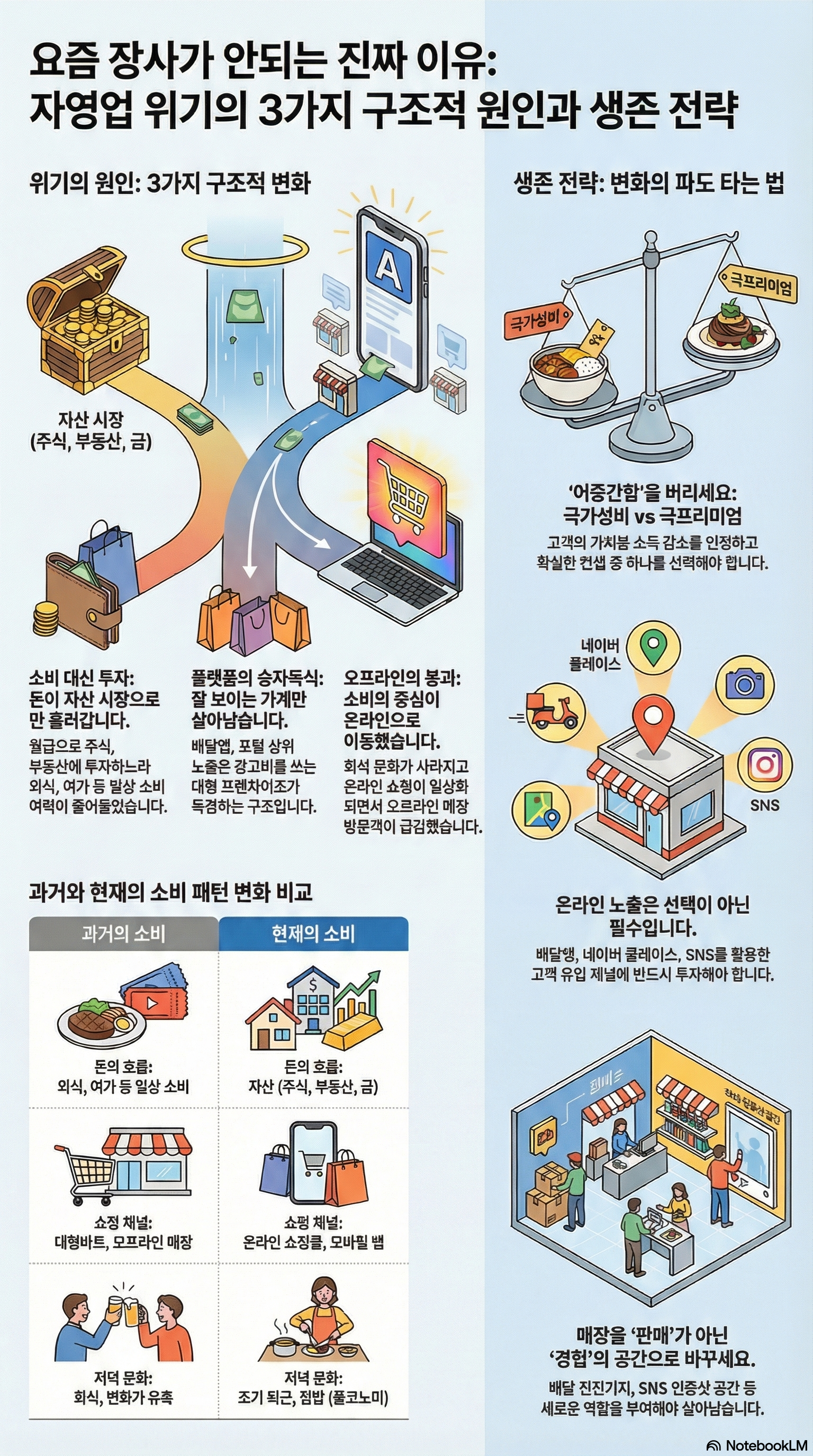 - 핵심 1. 절대적 소득 파악: 고객의 절대적인 가처분 소득이 줄었다는 점을 인정하고, 객단가 상승보다 '최소 비용의 가성비' 혹은 '극도의 프리미엄 경험' 중 하나를 선택해야 합니다. 어중간한 포지션은 가장 위험합니다.