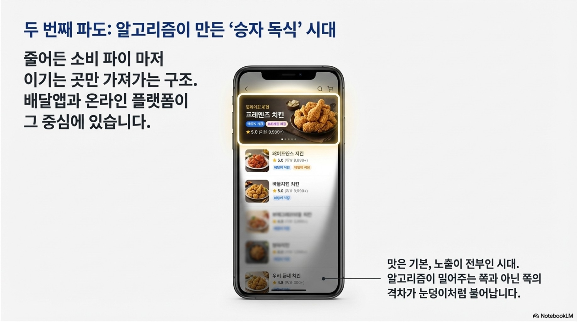 전체 소비 파이가 줄어드는 것도 문제인데, 그나마 남은 파이마저 이기는 곳만 가져가는 '승자 독식(Winner-take-all)' 구조가 배달앱과 온라인 플랫폼을 중심으로 굳어지고 있습니다. 손님들은 자연스럽게 프랜차이즈, 대형 브랜드, 그리고 플랫폼 상위 노출 업체들로만 몰려듭니다.