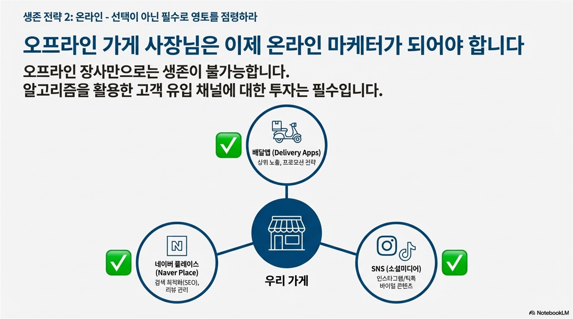 - 핵심 2. 온라인 마케팅 집중: 배달앱 프로모션, 네이버 플레이스 SEO, 인스타그램/틱톡 바이럴 마케팅 등 알고리즘을 활용한 고객 유입 채널에 대한 투자를 '선택'이 아닌 '필수'로 인식해야 합니다. 오프라인 장사만으로는 생존이 불가능합니다.