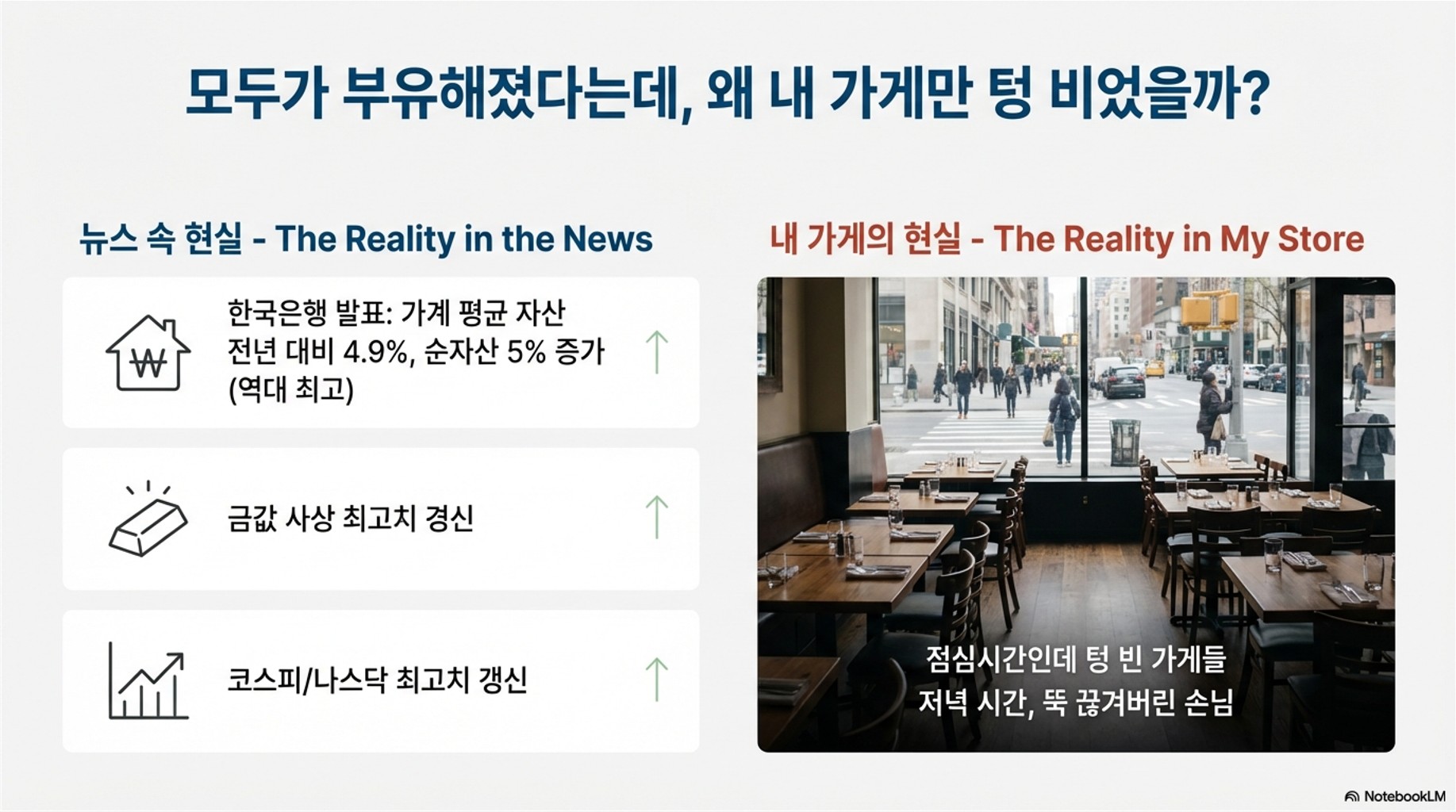 숫자만 보면 대한민국이 부자 나라가 된 것 같은데, 왜 유독 자영업자 입장에서는 장사가 갈수록 어려울까요? 동네만 돌아봐도 점심시간인데 텅 빈 가게들이 너무 많고, 저녁 시간 술집도 손님이 뚝 끊긴 상황입니다. 😢 오늘은 이처럼 자산은 늘어났는데 소비는 줄어드는, 자영업이 대폭망 중인 세 가지 구조적인 이유를 깊이 있게 분석해 보는 시간을 갖겠습니다. 이 구조를 이해해야만 다음 단계를 계획할 수 있습니다!