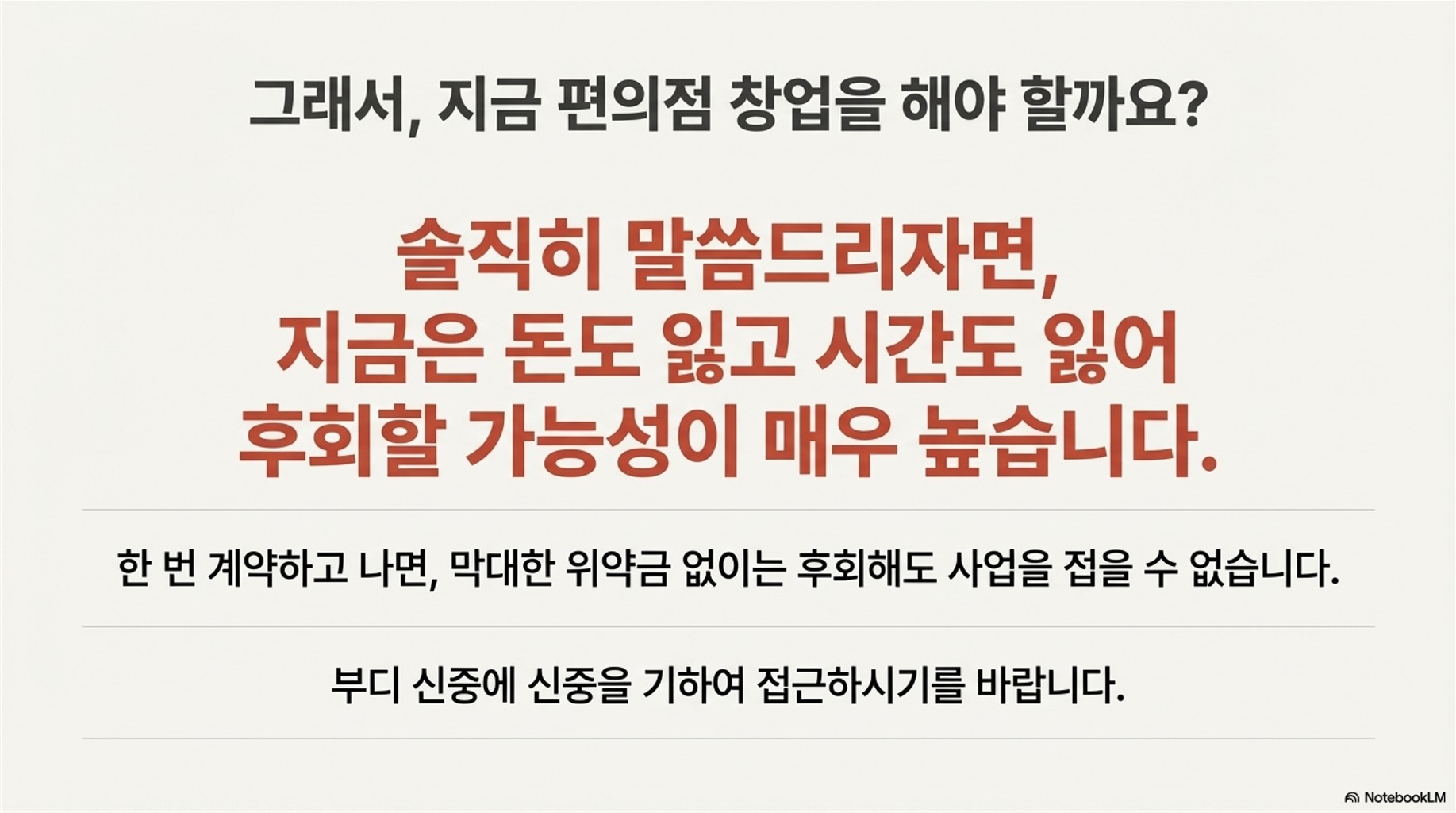 아직도 저에게 메일이나 댓글로 "편의점 이 정도 조건이면 창업해도 괜찮지 않을까요?" 하고 물어보시는 분들이 많이 계세요. 솔직히 말씀드리자면, 지금 이 타이밍의 편의점 창업은 돈도 잃고 시간도 잃어서 후회할 가능성이 매우 높습니다.
