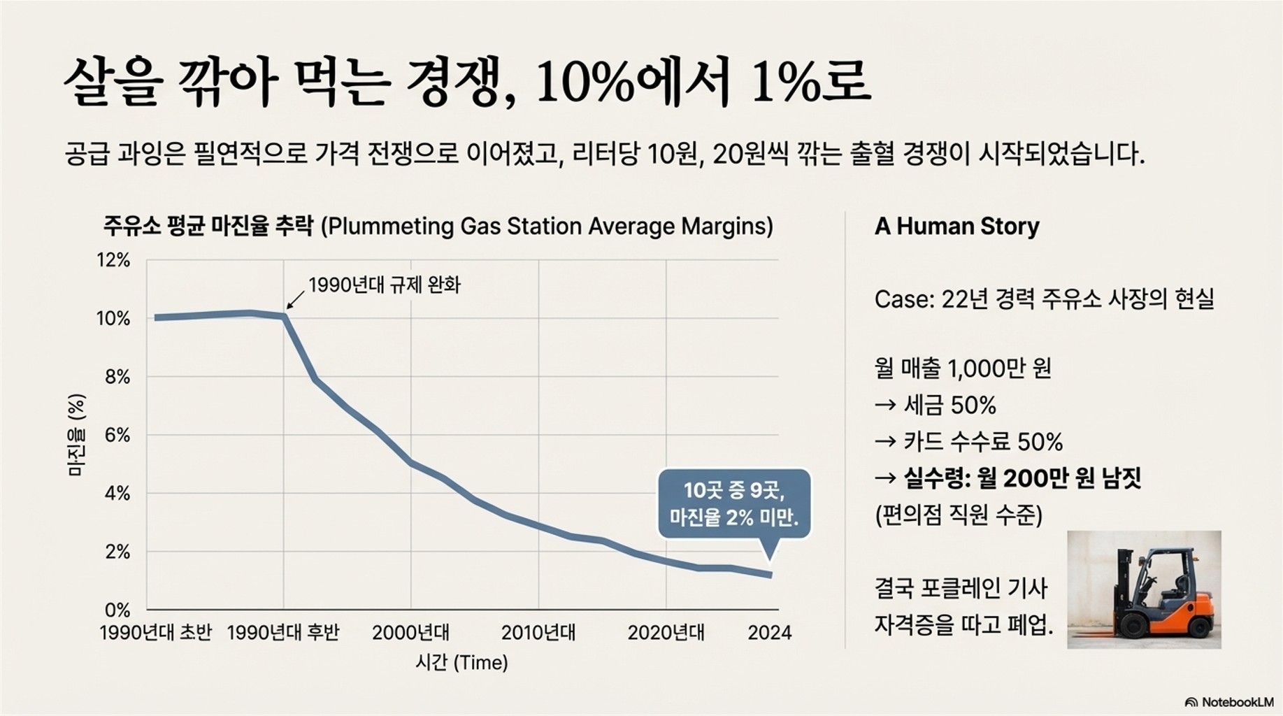 최근 조사에 따르면 전체 주유소의 90%가 마진율 2%를 밑돈다고 합니다. 10,000원어치 팔아봤자 200원도 안 남는 구조죠. 여기서 카드 수수료 떼고 직원 월급 주면 사실상 적자인 곳이 수두룩합니다. 실제로 22년간 주유소를 하셨던 한 사장님은 월 매출이 1천만 원이어도 실제 손에 쥐는 건 200만 원도 안 돼 결국 포클레인 기사 자격증을 따고 폐업을 결심했다고 하네요. 😢