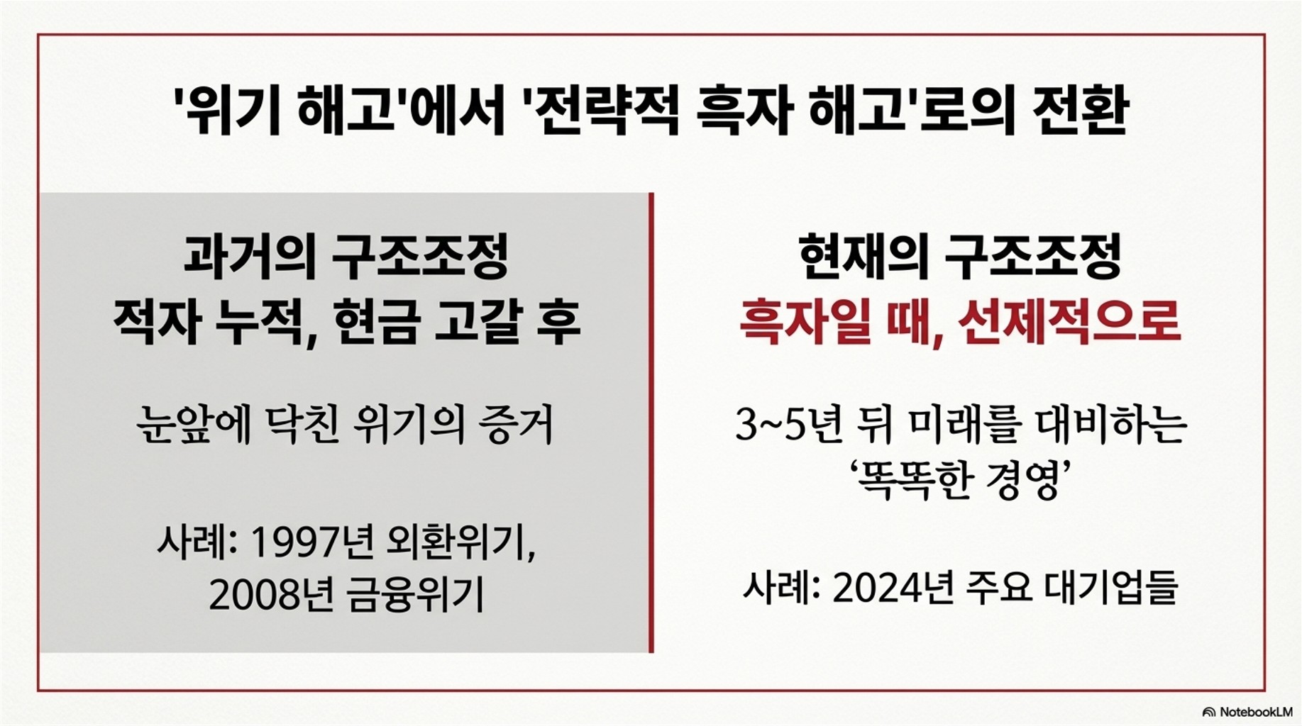 - 흑자 해고: 대기업들은 이제 살아남기 위해 돈을 벌 때도 사람을 내보내는 '선제적 구조조정'을 택합니다.