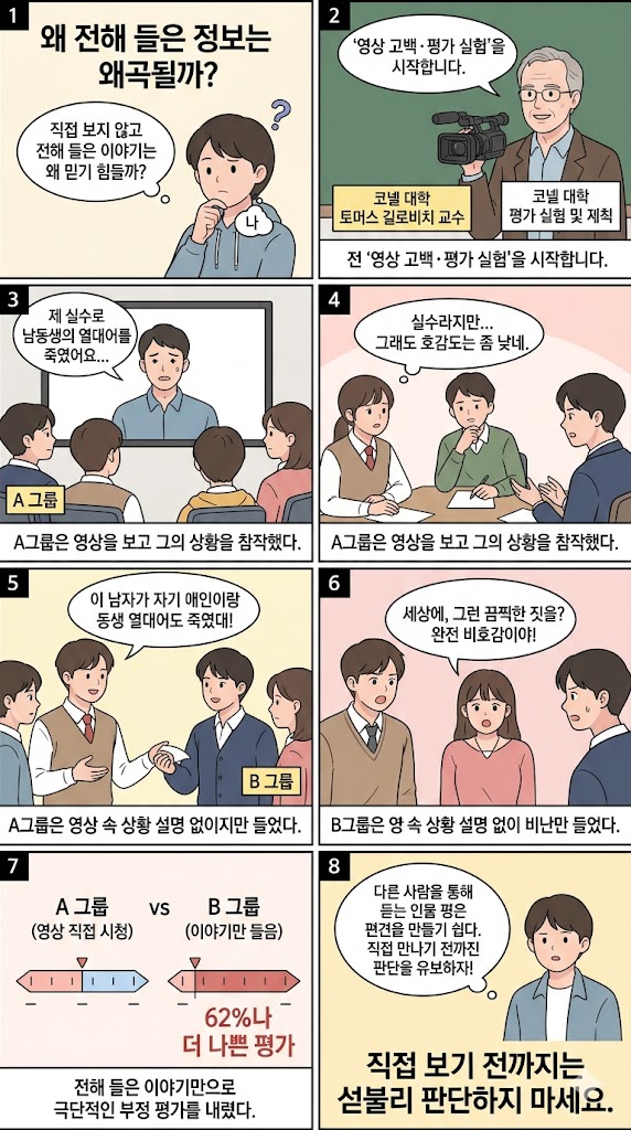 결국 길로비치 교수의 실험이 우리에게 주는 교훈은 명확합니다. "남의 말을 다 믿지 말라"는 것이죠. 우리가 전해 듣는 이야기는 이미 누군가의 손에 의해 가공되고 맥락이 싹둑 잘려 나간 '편집본'에 불과할지 모릅니다. 누군가에 대해 실망스러운 이야기를 들었다면, '내가 모르는 맥락이 있을 거야'라고 한 번 더 생각해보는 건 어떨까요? 😊