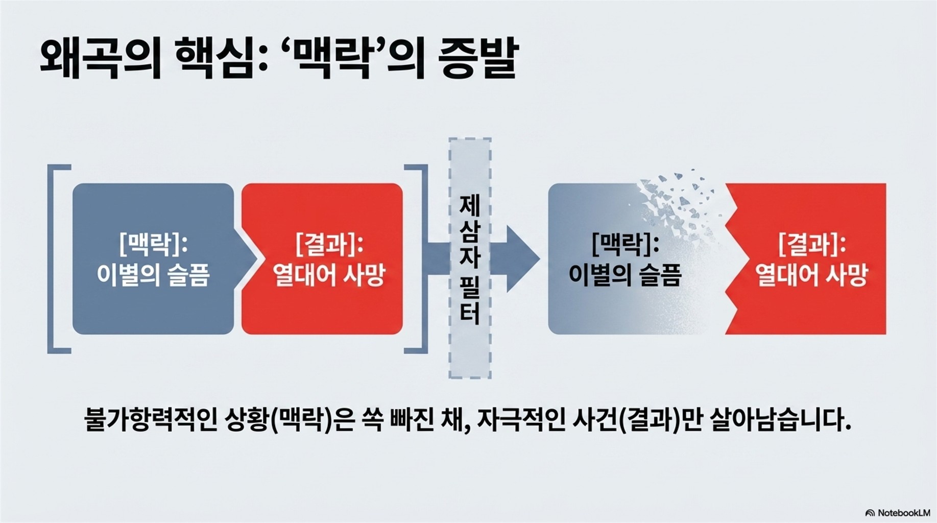 "김 대리가 어제 회의에서 좀 피곤해 보이더라"는 말이 세 명을 거치면 "김 대리는 일에 의욕이 전혀 없고 회사 생활을 불성실하게 한다"는 평판으로 둔갑합니다. 중간 전달자가 김 대리의 전날 야근 맥락을 삭제했기 때문이죠.